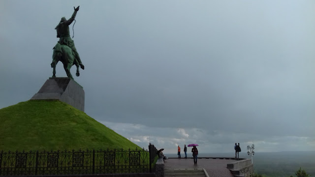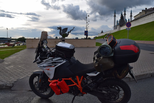 Утром с комарами мы готовим чай. Дорога от Казани до Уфы у меня запомнилась монотонными прямыми участками на скоростной трассе с ремонтами и боковыми ветрами. Обедаю в кафешке для дальнобойщиков. Хорошее место легко отличить по количеству фур припаркованных возле него. Тут их было не менее сотни. После завтрака чищу и мажу цепь, и снова в путь. Еду через Набережные Челны, где жила моя знакомая, отправляю ей фотку в надежде что она здесь, но она видимо сейчас в Москве и отвечает с опозданием. Солнце припекает, голова разболелась. Выпил таблетку, еду на автомате, не запоминая происходящее. Как въезжал в Уфу совсем не помню. Сознание вернулось уже возле макдака, когда я пил кофе. По программе посещение местных достопримечательностей, а именно памятник Салавату Юлаеву, где снова начинает лить дождь.