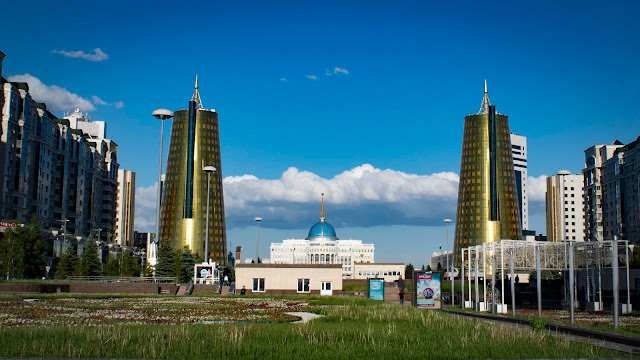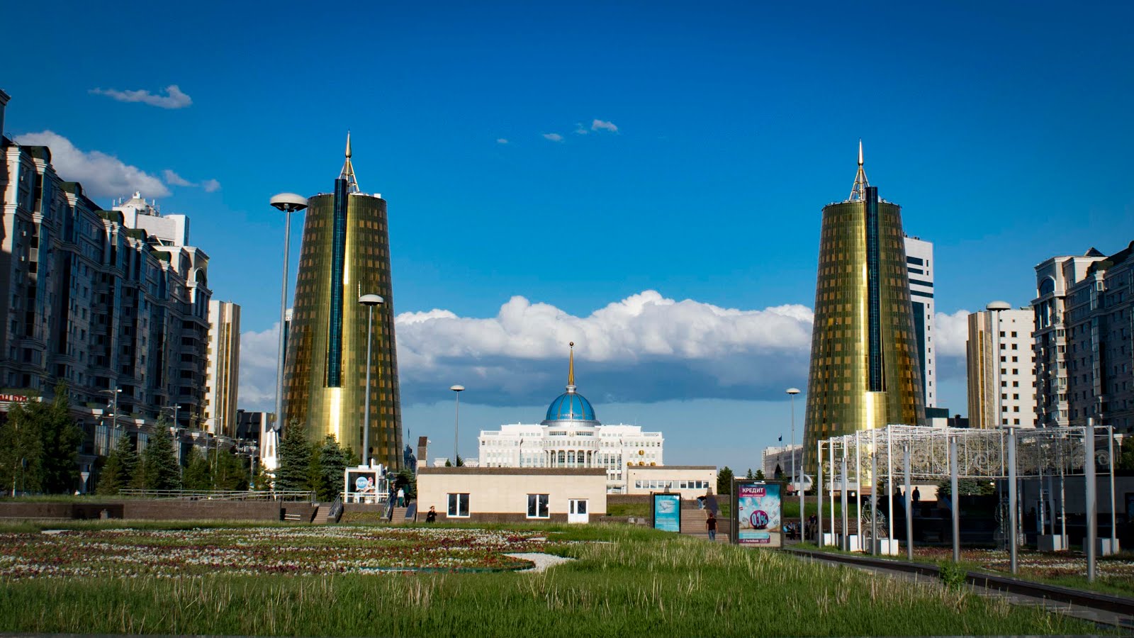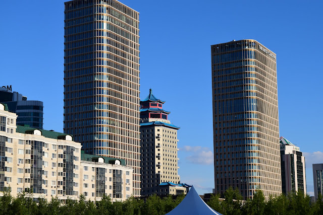 Окраина Астаны напоминает трущобы из к/ф 9-й район, но чем ближе к центру тем выше и аккуратней дома, ухоженней улицы, дороже витрины и вот уже центр слепит меня сиянием золотых небоскрёбов. Невероятный контраст!