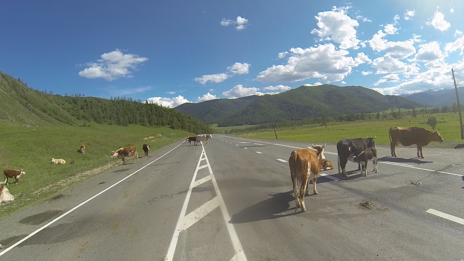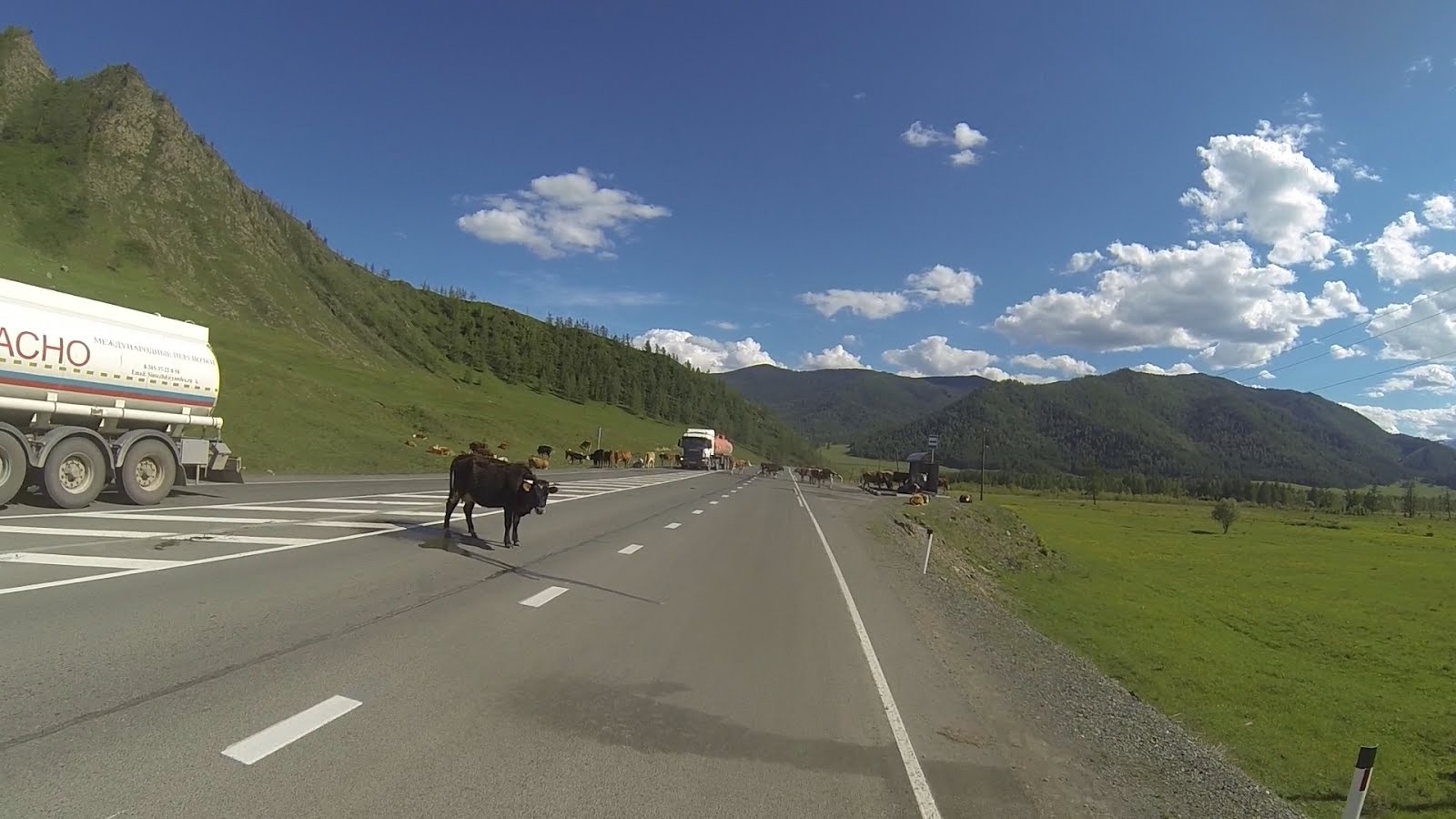 Перед Онгудаем возвращаюсь на Чуйский тракт и застаю картину, как большегрузы сбавляют скорость чтобы объехать стоящее на дороге стадо, коровам при этом нет дела до того, что происходит вокруг. Одна из них спит, другая кормит телёнка, а третья справляет нужду.
