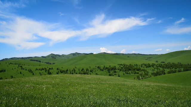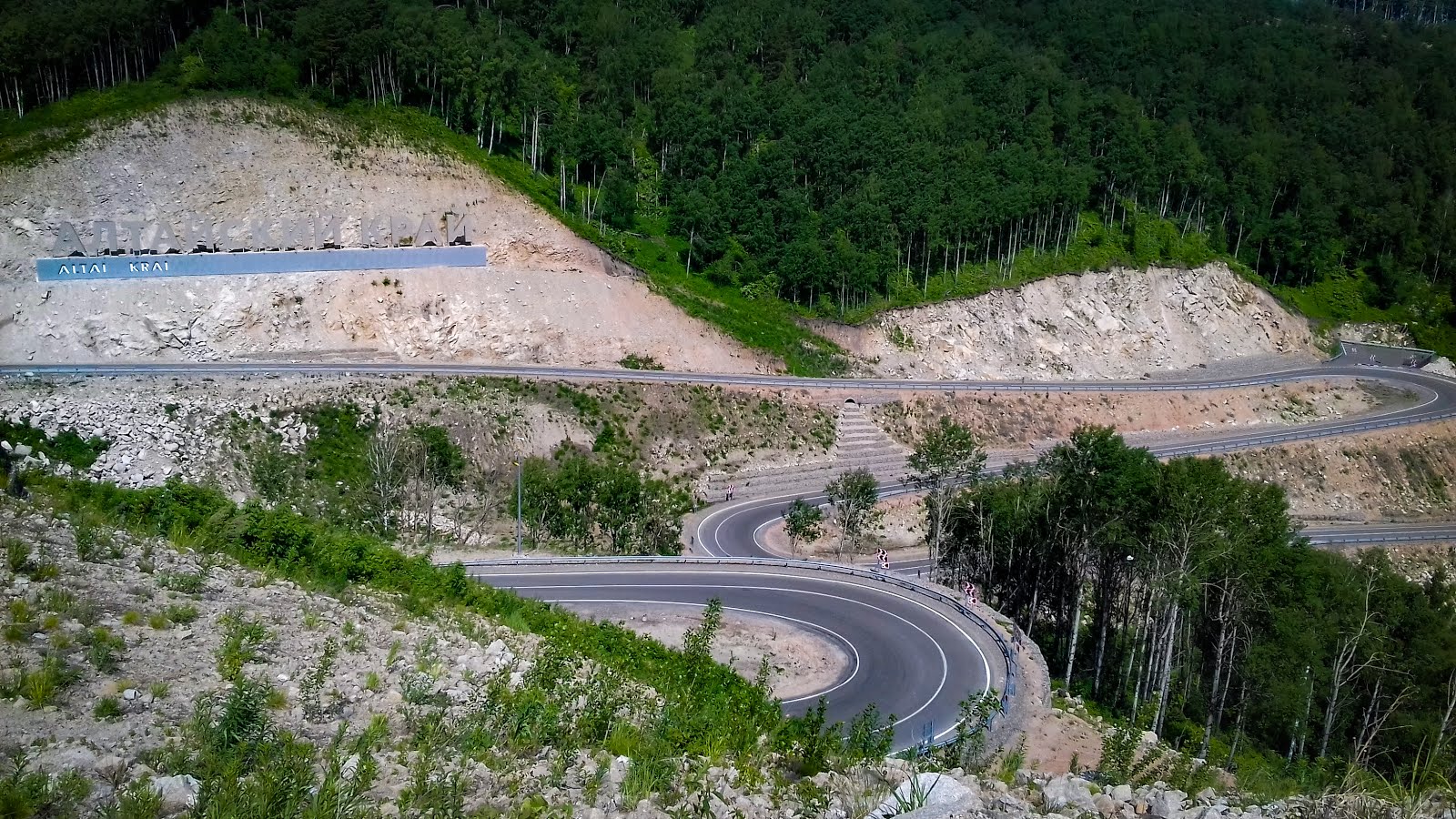 Если ехать через Горно-Алтайск то горы начинаются практически мгновенно. Через Солонешное всё иначе. Поначалу горы видны лишь из далека и представляют из себя зелёные холмы. Затем мы не на долго поворачиваем в Белокуриху и попадаем в красивейшее место с вертикальными склонами и змейкой дорог уходящих в небо. Тут очень красиво, есть смотровые площадки, памятники и гигантская надпись на скале для любителей селфи.