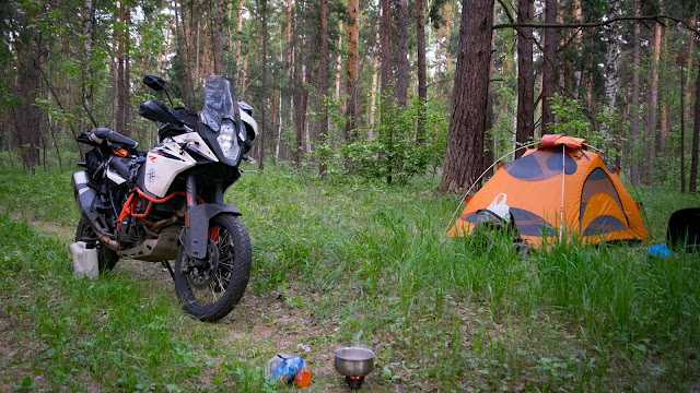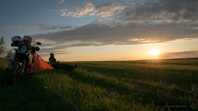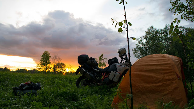 По возвращении на парковку знакомлюсь с парой на мотике, парень разглядывает мой аппарат, и предупреждает о тенденции к ослаблению спиц на таких моделях когда пробег приближается к 20т.км. Это как раз мой случай, а я их ни разу и не проверял. Вечером у палатки обнаруживаю, что подходящего ключа для натяжения спиц в заводском наборе инструментов нет и весь следующий день я буду думать только о том, как раздобыть этот ключ. На ночлег устраиваюсь в поле, в километре от трассы которая завтра поведёт меня через Урал. Ночевать в поле мне нравится больше чем в лесу. Виды шикарные, видимость до горизонта, никто не появится неожиданно, даже кота идущего по тропинке по своим делам я увидел из далека. Мы любезно с ним разошлись поздоровавшись. Любуюсь закатом, пью чай и засыпаю.