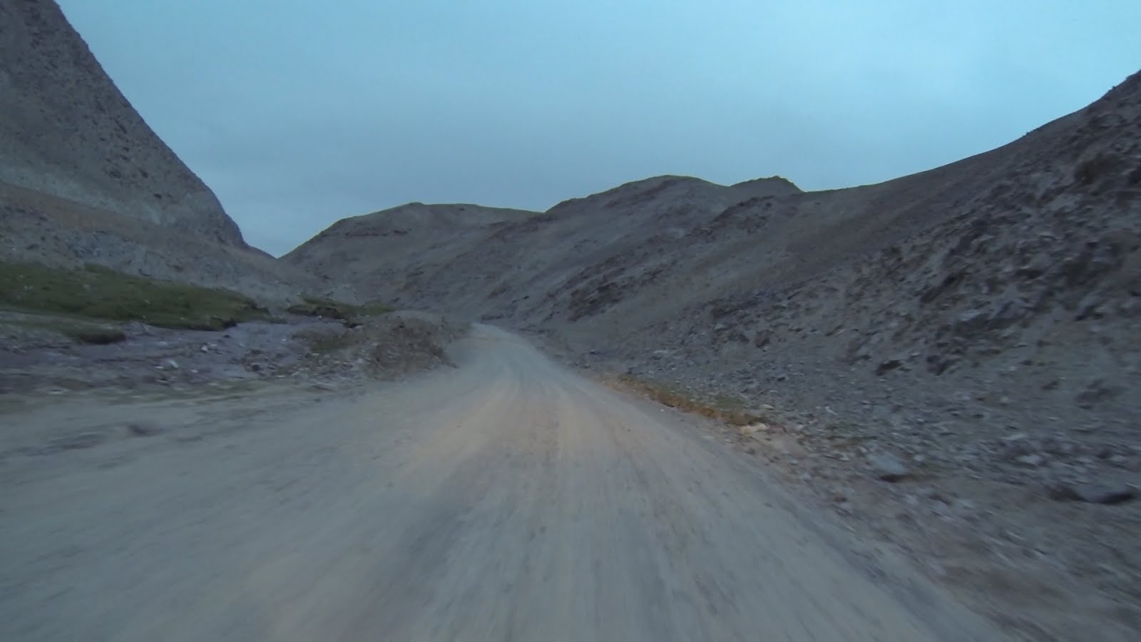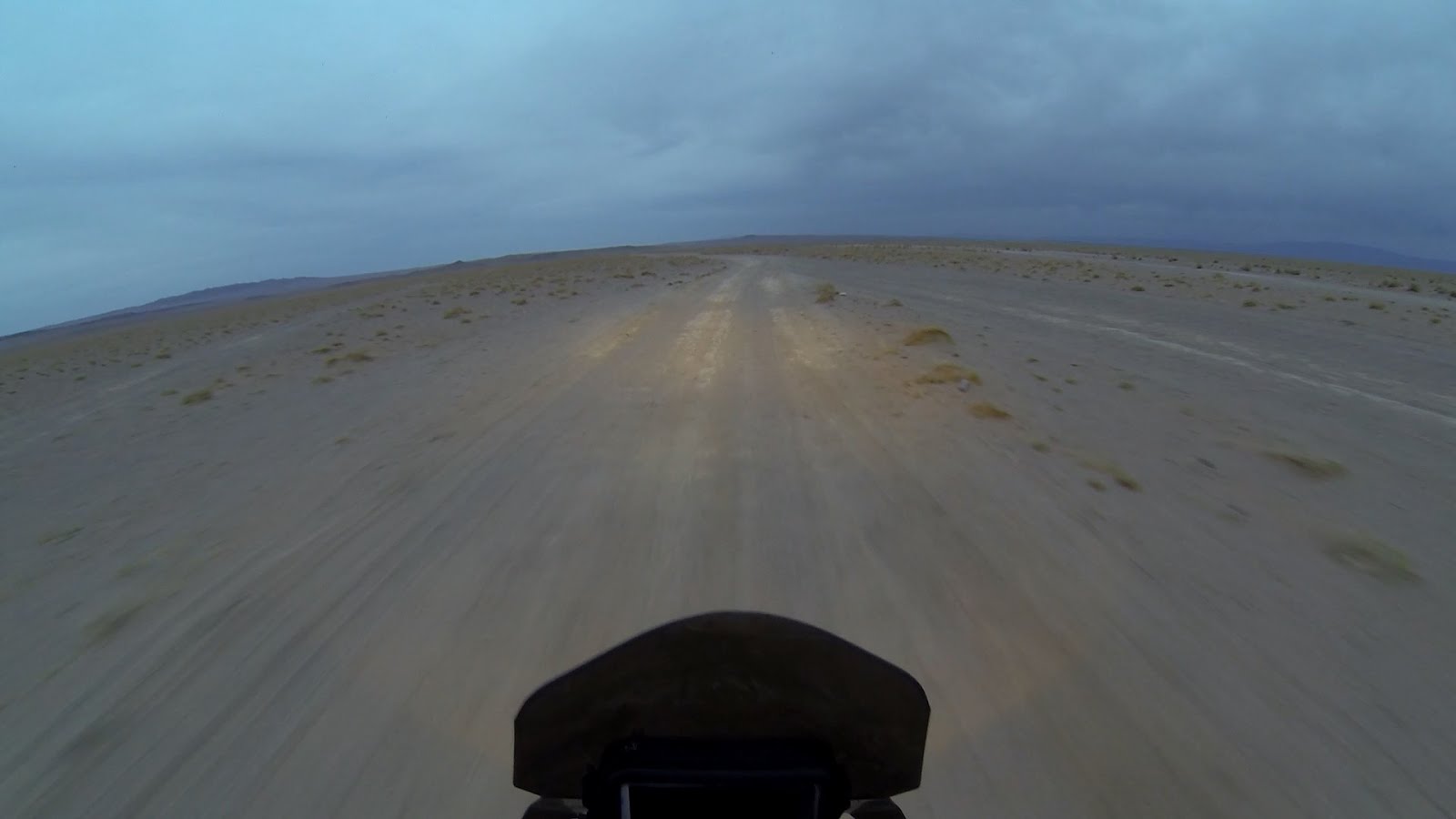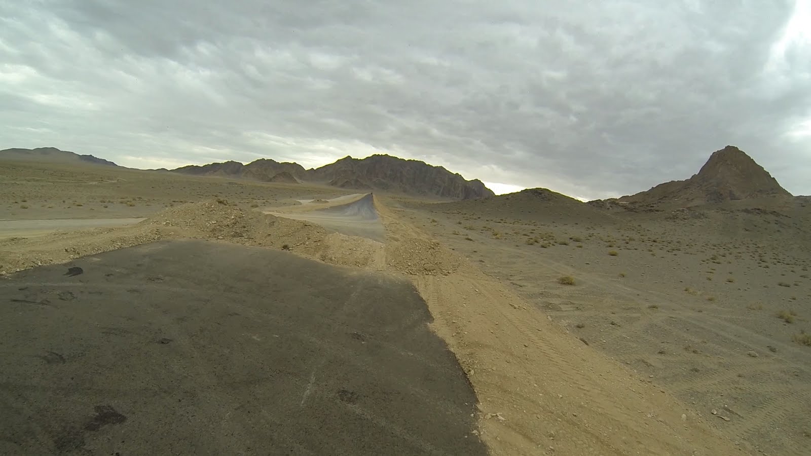 За спиной уже собралась гроза. Темнеет. Я заезжаю в горы. Дорога совсем не радует, то песок, то камни. Растительность сквозь такой грунт не пробивается. Двигаюсь вдоль строительства новой дороги, постоянно петляя.