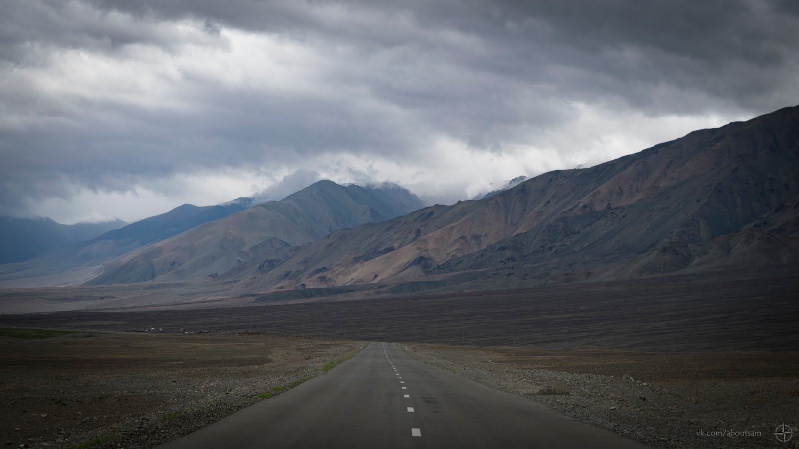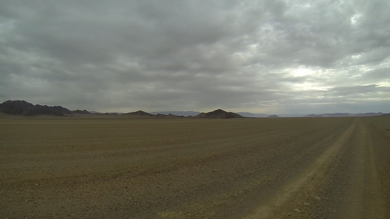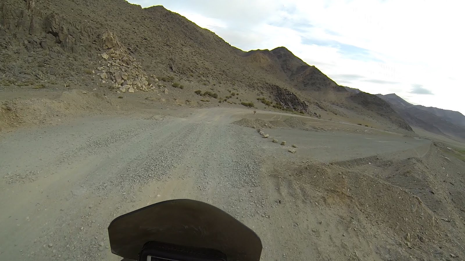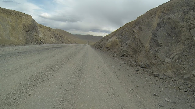 За спиной уже собралась гроза. Темнеет. Я заезжаю в горы. Дорога совсем не радует, то песок, то камни. Растительность сквозь такой грунт не пробивается. Двигаюсь вдоль строительства новой дороги, постоянно петляя.