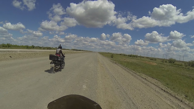 Чай на завтрак и снова в седло. Ночевал в 40км от Астаны возле н.п. Приречное. Сегодня предстояло доехать до границы около 540км. А дальше по ситуации. Выдвинулся рано. Дорога пустая, свободная, ровная. Но через некоторое время стали появляться признаки ни то ремонта, ни то строительства. Еду 110. Нарушать не решаюсь, да и местные едут так же и ни на км больше. Значит бояться есть чего. Пару раз замечаю засады ДПС. Дорога сужается. Вот уже еду по встречке, кругом ремонт, но пока ещё под колёсами асфальт. Перед н/п Шидерты дорога начинает ощутимо меняться и не в лучшую сторону. Появляются участки с разбитым асфальтом, где вместо него грунтовка или просто гора щебня возвышающаяся над дорогой на метр. Всё это дело покрывает слой пыли. Перед посёлком заезжаю на АЗС. Неожиданно встречаю на АЗС туристку на BMW F700GS. Она едет домой в Барнаул из одиночного путешествия по Азии. Дальше договариваемся ехать вместе.