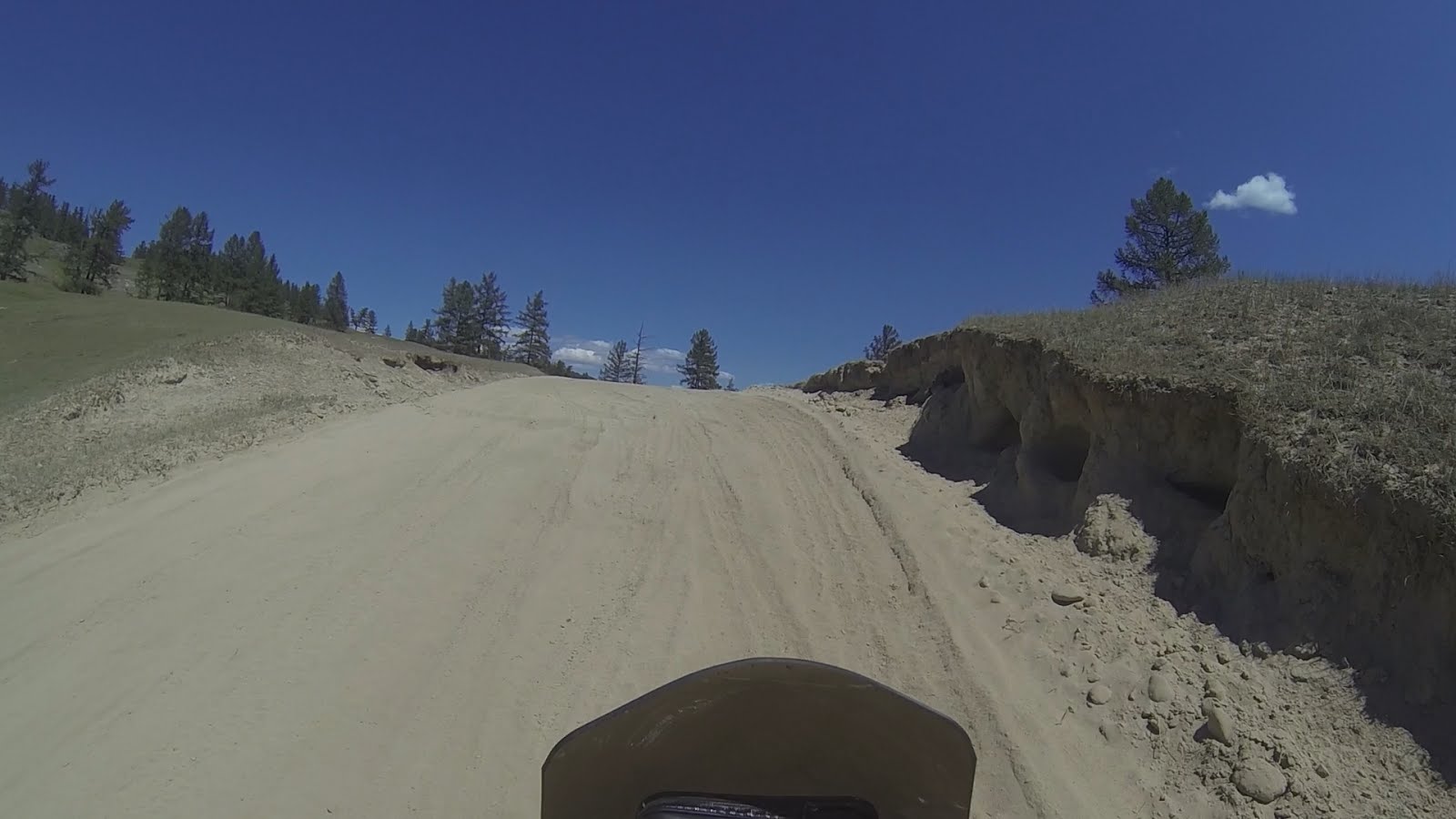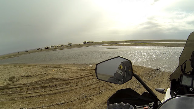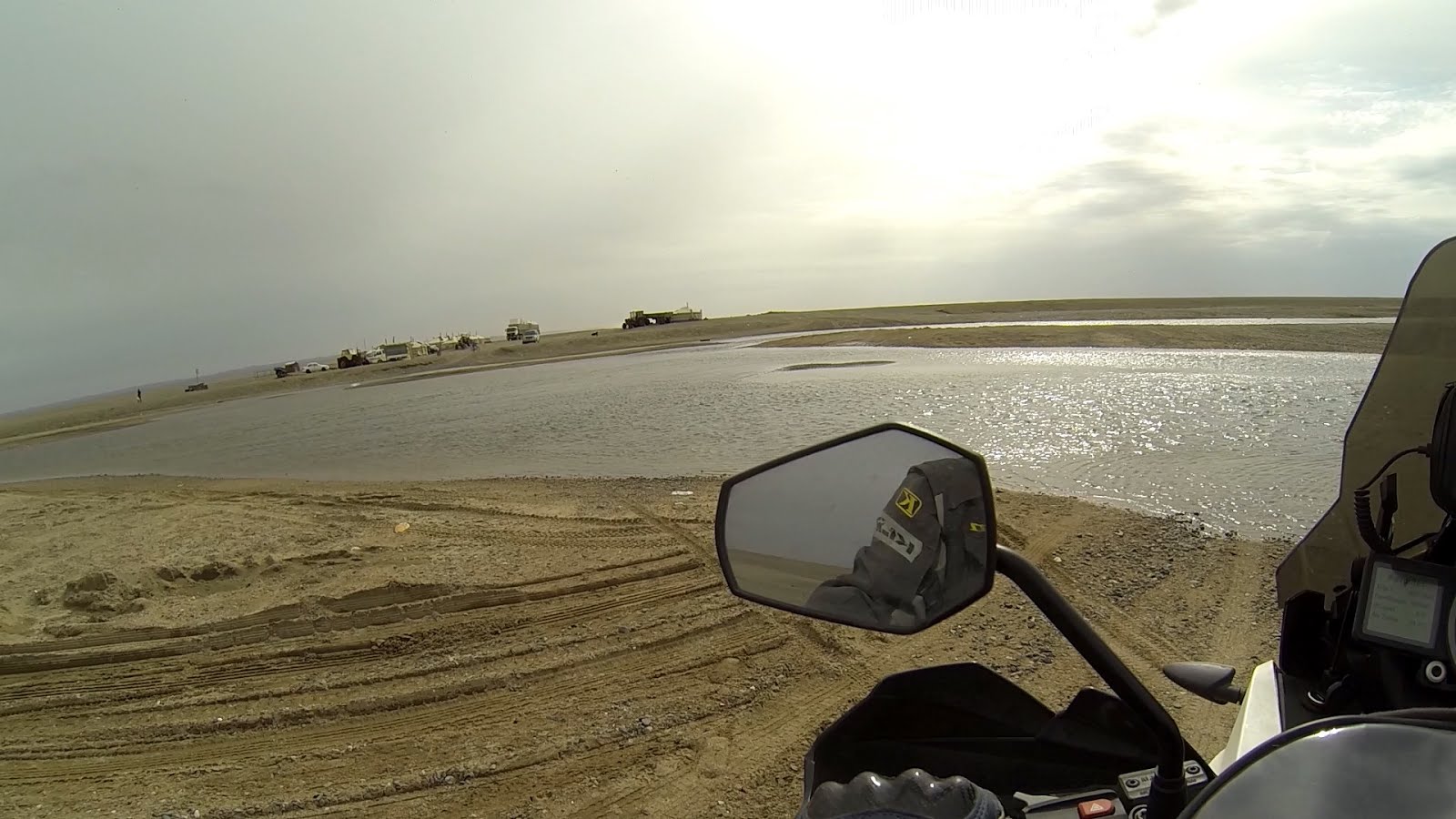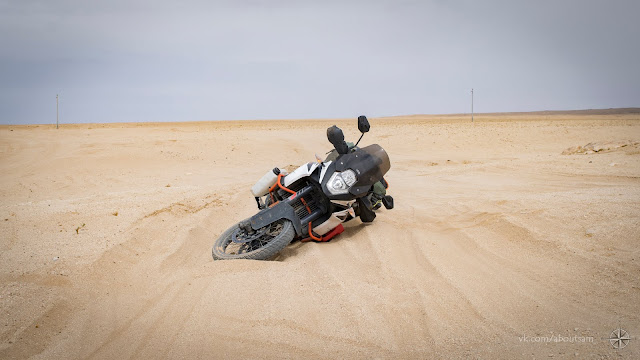 Дальше песка на дороге становится всё больше. Деваться некуда, остаётся только совершенствовать свои навыки езды. Песок глубокий и рыхлый. Лучше всего получается преодолевать особо сложные места на открытом газу разгружая перед и крепкой хваткой держа руль, не давая переднему колесу свернуть с колеи и зарыться. Но падения избежать не удаётся. Продолжаю прокачивать скилл.