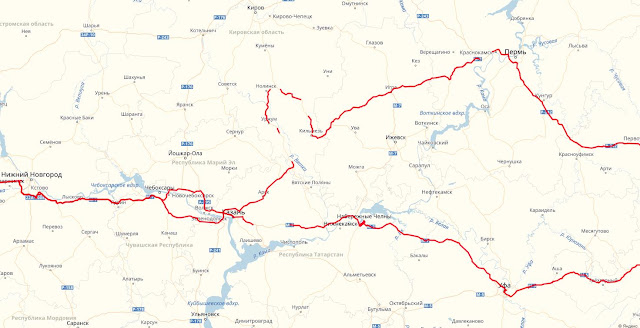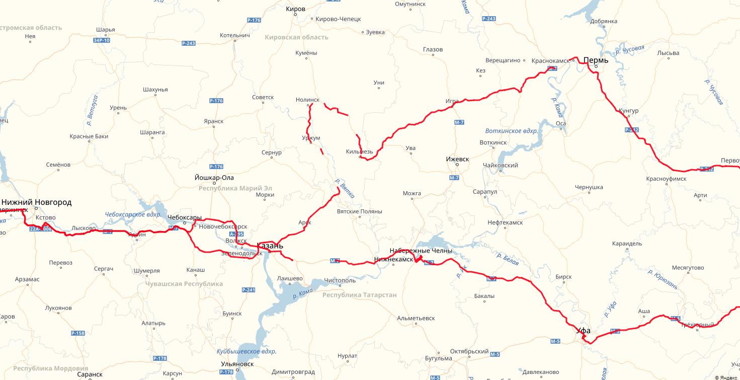 Сегодня предстояло метнуть оставшиеся 1300 до дома. Но не всё пошло по плану. Последним крупным городом маршрута должна была стать Кострома. Для этого из Перми следовало ехать через Киров. Выехал я опять рано. Разница во времени с Москвой целых 2 часа. Я проезжаю 200 км и перевожу часы назад, у меня снова есть эти же 2 часа. Так что если соберётесь пилить ЖЖ езжайте с востока на запад. Дальше навигатор повёл меня очень странной дорогой, и я долгое время трясся по убитым дорогам второстепенного значения. От тряски провод зарядки телефона периодически отходил и телефон выключался из-за севшей батареи. Средняя скорость упала до 60 и я прикинул что в таком темпе не доеду сегодня до дома. В итоге плюнул на свои планы и поехал проверенной дорогой через Казань. Получился не хилый такой крюк и по итогу дневной пробег перевалил за тысячу миль.