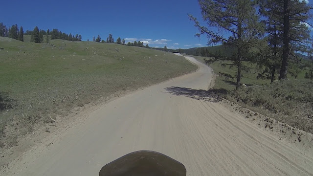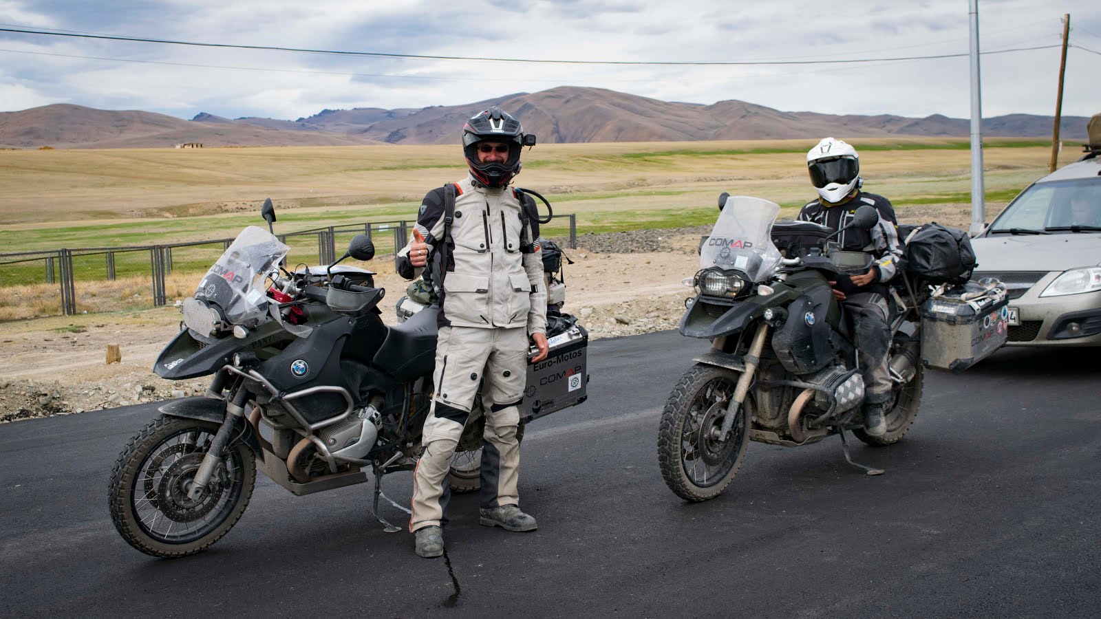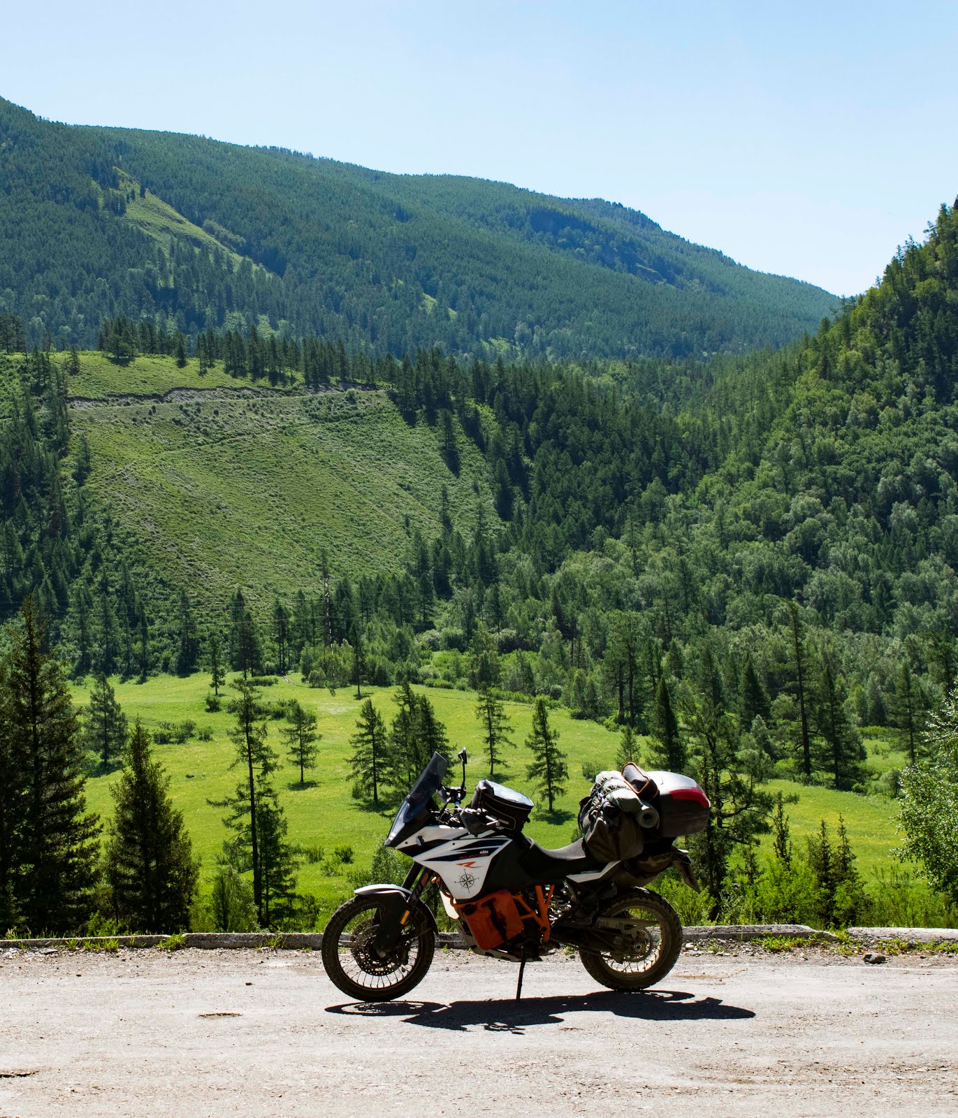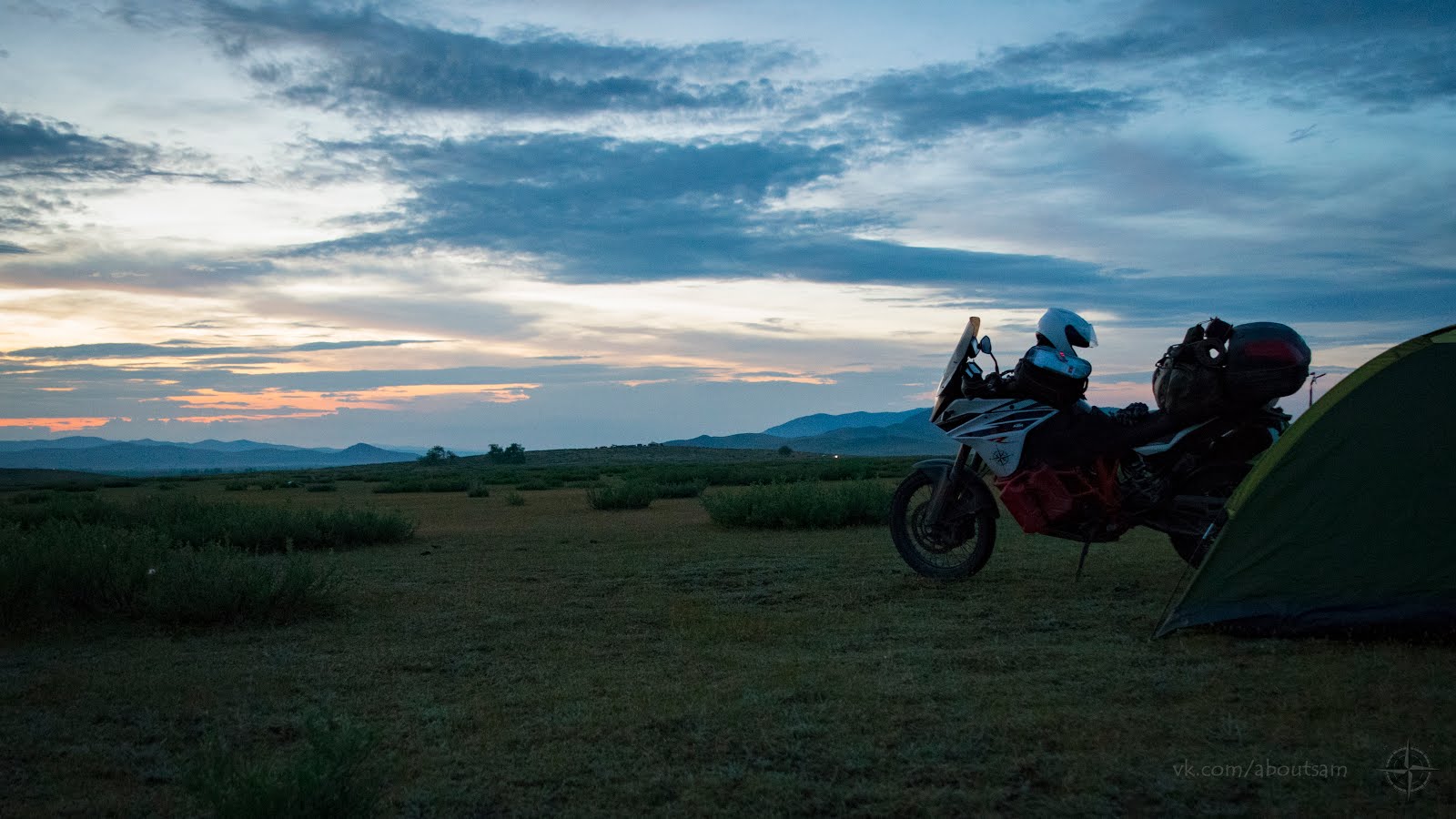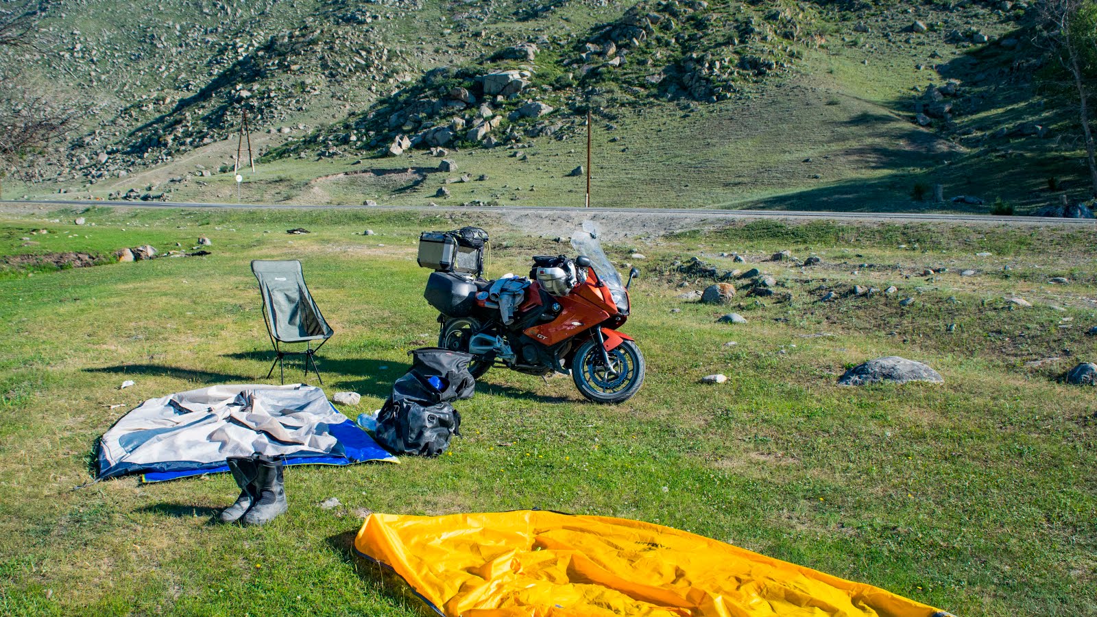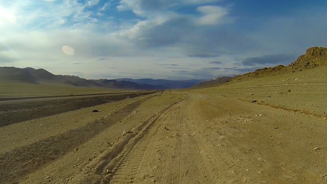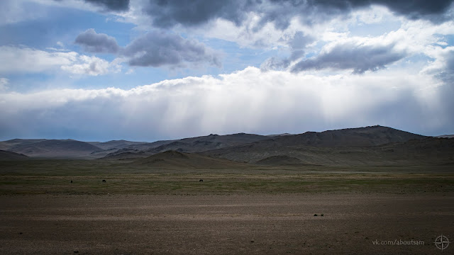 На небе ни облачка. У меня есть день чтобы покинуть Алтай, и завтра сюда по прогнозу приходят дожди. Не теряя времени собираюсь в дорогу. Представьте моё удивление когда отъехав от места ночёвки 300 метров, за поворотом я вдруг вижу тоже мото туриста, собирающего палатку. Приветствую его сигналом, он машет мне рукой. Я сворачиваю к нему. Этот парень из Южной Кореи совсем молод на вид, едет один на дорожном BMW F800GT и уже проехал Китай и Монголию. На слабом английском интересуюсь дорогами и заправками в Монголии, он достаёт бумажную карту и показывает где он не смог проехать из-за песка, пришлось возвращаться в Улан-Батор и ехать другой дорогой. Снова и снова я слышу предостережения про глубокий песок и острые камни.