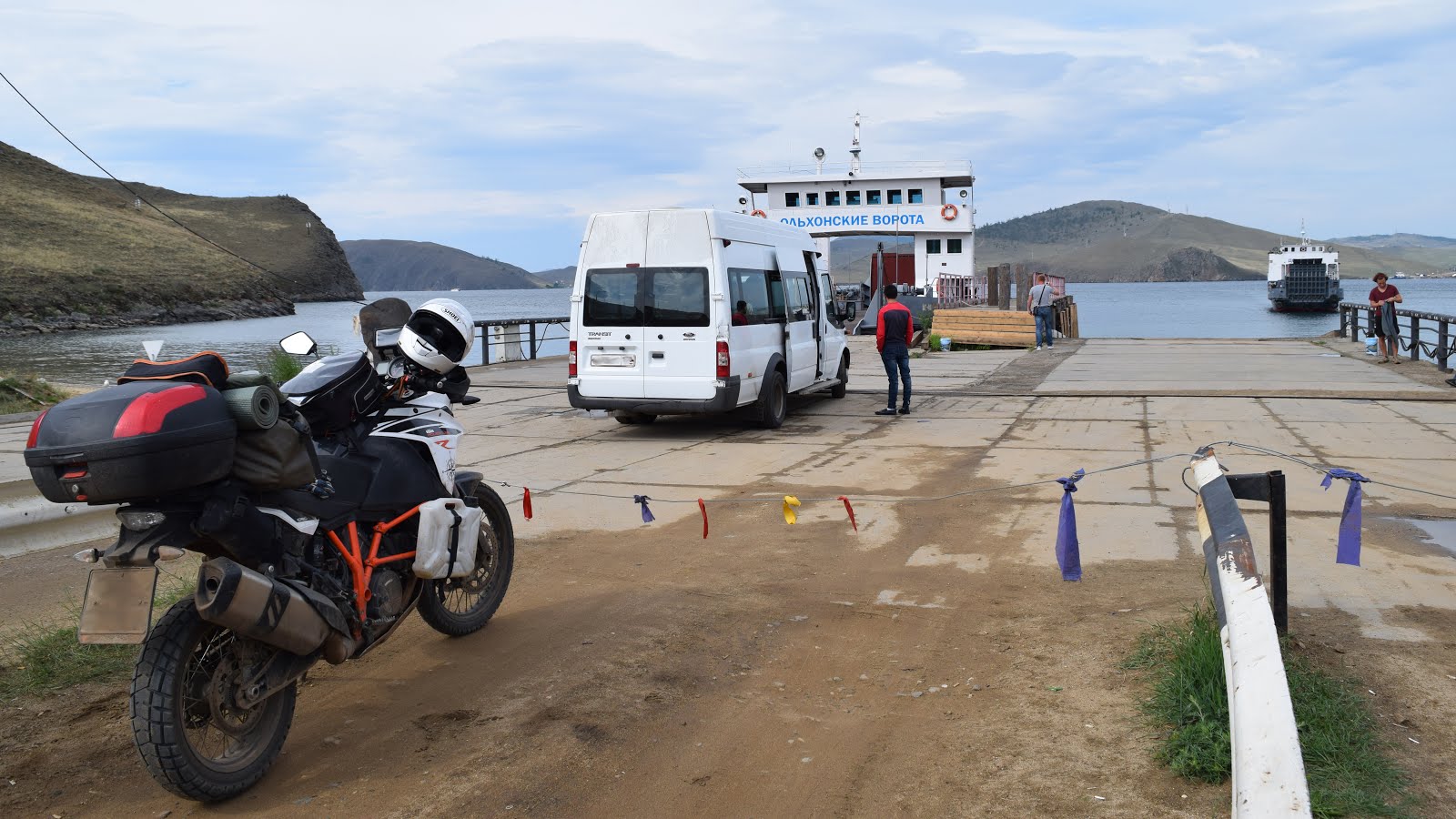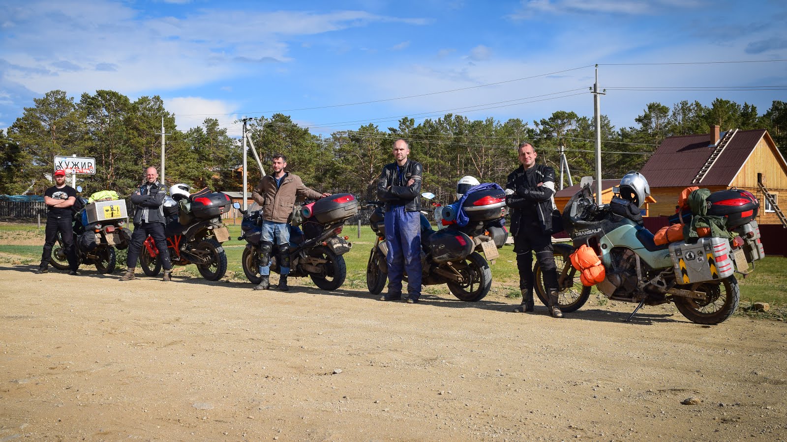 Пару раз кто-то из наших роняет мот. На въезде в Хужир фоткаемся счастливые, для каждого из нас это очень значимое событие. Да да, нас уже пятеро, сам не заметил когда нас стало больше.