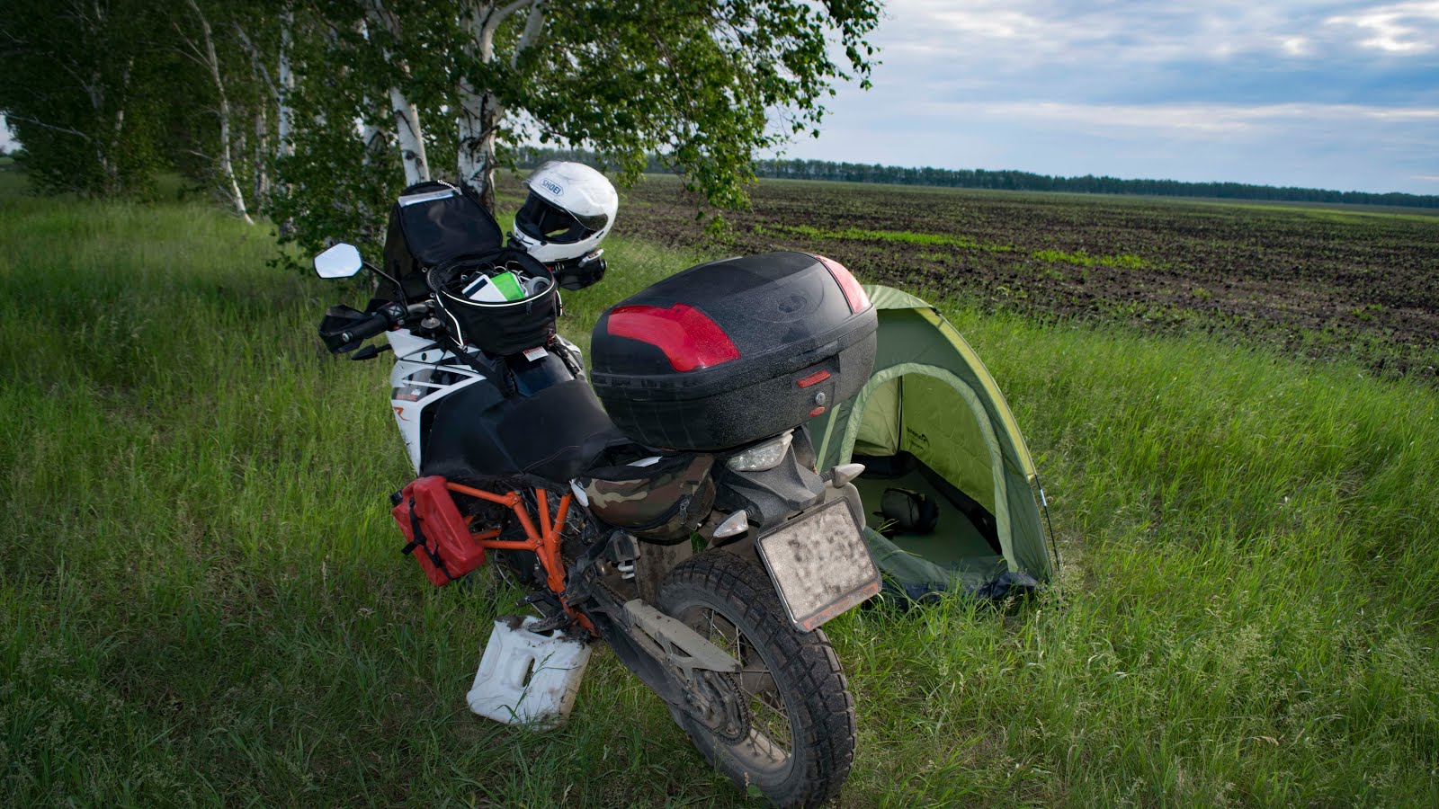 Следующая оказия случилась уже вечером, когда искал место для палатки. Кругом поля с лесополосами, недавно прошли дожди, и земля сырая. Съехав на грунт заваливаюсь на бок. Снимаю багаж, возвращаюсь на твёрдую землю, проверяю повреждения: правое зеркало в паутинку. Да еманарот! когда же этот день закончится!?