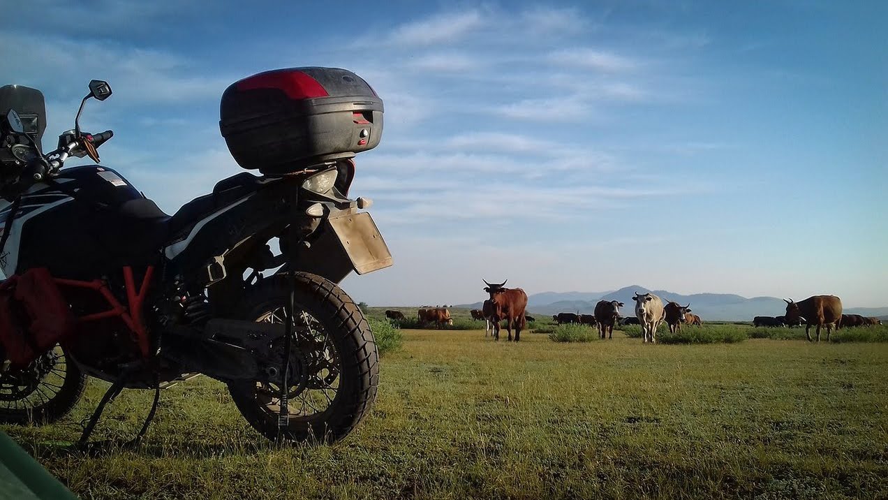 Просыпаюсь от того что слышу чьи-то шаги возле палатки. Расстёгиваю молнию и тем самым спугиваю коров пробующих на вкус пыль с моего номерного знака. Эта пыль - оберег от штрафов в моей родной стране. Кыш!
