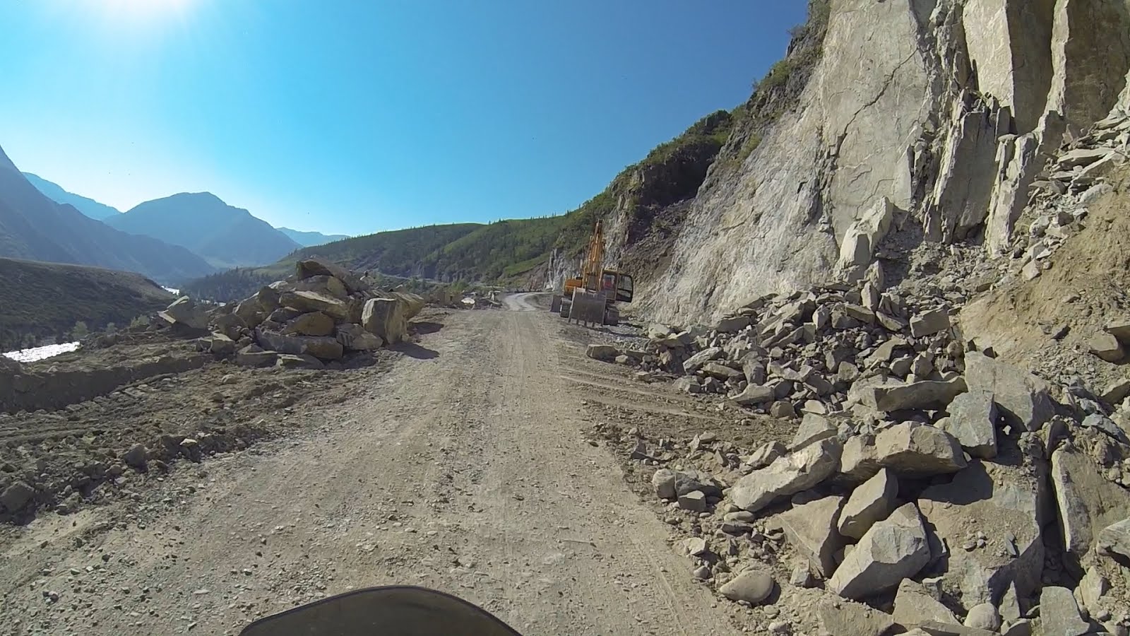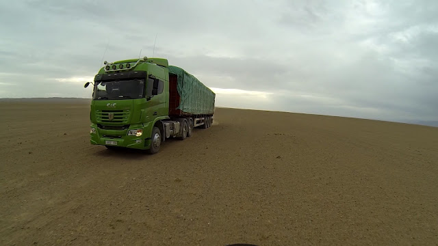 Дорога постоянно меняется и в то же время нет. Под колёсами то камни, то песок. Изредка встречается дорожная техника строящая рядом трассу.