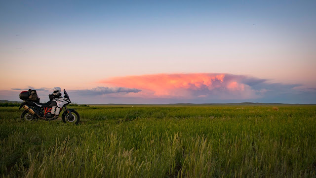 Дальше только в сторону дома, а точнее границы с Россией. Сегодня до наступления темноты я уже не успеваю до неё добраться, и потому снова ночую в поле под звёздами. А пока успеваю полюбоваться игрой красок неба на закате.