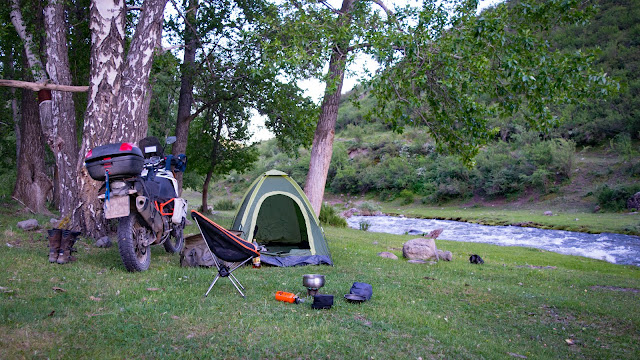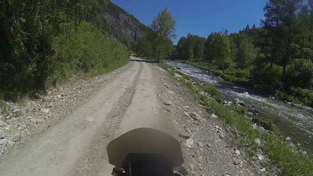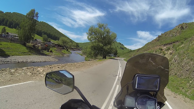 100 км бездорожья ведущих сюда, были хорошей тренировкой перед спуском с перевала, так что он уже не кажется таким уж страшным. Я видимо уже приноровился ехать в стойке по камням, так что единственное за что переживаю теперь, это не перегреть бы тормоза и когда есть возможность просто скатываюсь на первой передаче. Внизу есть гостевые домики и кафе. Решил отметить удачный спуск порцией плова и немного прокатиться вдоль Чулышмана.