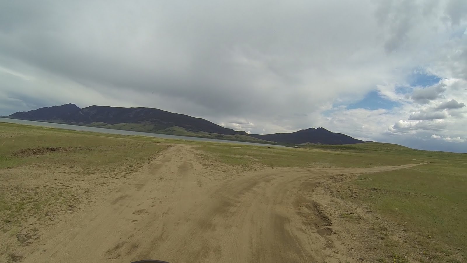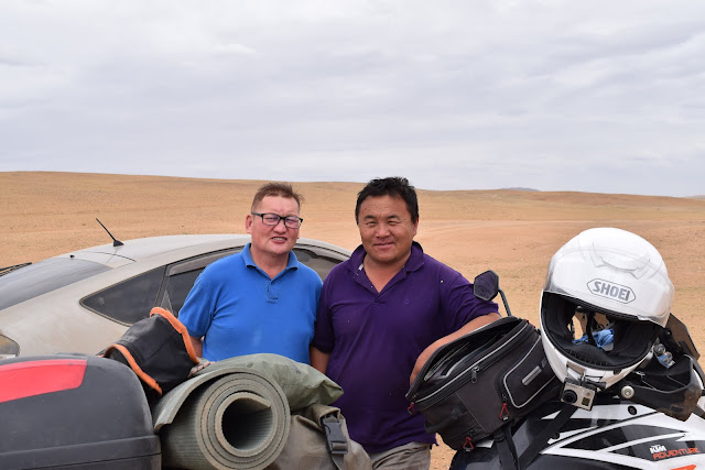 Пару слов про мотоцикл. Иногда я поднимаю его не отвязывая багаж стоя к нему лицом, одной рукой держа его за руль, а второй за пассажирскую ручку. Но если я уже устал, мало сил или как здесь под ногами каша или глубокий песок, то он соскальзывает и требуется приложить силу с большей вертикальной составляющей тогда я отстёгиваю кофр и этого обычно хватает. Песчаный участок не очень большой, дальше дорога лучше. Всё чаще попадаются автомобили, после брода уже штуки 3 видел. Когда доезжаю до строящейся дороги устраиваю перекур, Баянхонгор уже близко. Очередное дорожное знакомство.