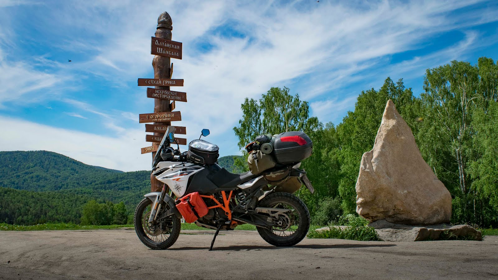 На небе ни облачка. У меня есть день чтобы покинуть Алтай, и завтра сюда по прогнозу приходят дожди. Не теряя времени собираюсь в дорогу. Представьте моё удивление когда отъехав от места ночёвки 300 метров, за поворотом я вдруг вижу тоже мото туриста, собирающего палатку. Приветствую его сигналом, он машет мне рукой. Я сворачиваю к нему. Этот парень из Южной Кореи совсем молод на вид, едет один на дорожном BMW F800GT и уже проехал Китай и Монголию. На слабом английском интересуюсь дорогами и заправками в Монголии, он достаёт бумажную карту и показывает где он не смог проехать из-за песка, пришлось возвращаться в Улан-Батор и ехать другой дорогой. Снова и снова я слышу предостережения про глубокий песок и острые камни.Он интересуется, где найти механика по BMW, я даю ему координаты байк поста в Бийске, думаю там точно или помогут или скажут где могут помочь. В ответ я получаю подарок, ту самую бумажную карту Монголии. Это самый ценный подарок, о котором я только мог здесь мечтать. Желаем друг другу удачи и прощаемся.
