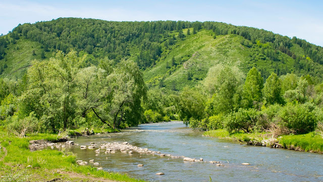 После Алтая через 120 км дорога поворачивает налево а навигатор продолжает вести прямо. Примечательно что в этом самом месте стоит какая-то забегаловка и шиномонтаж. Не спроста, думаю я. Торможу, разворачиваюсь и иду пить кофе. Пристаю с расспросами к девушке на ресепшн. Она приводит языка и ситуация проясняется. Асфальт ведущий левее скоро закончится и начнётся горная тропа, дорогу только строят и в горах будет много острых камней, если же съехать с дороги сейчас то покрытие будет лучше но через 200 км придётся пересекать реку в брод. По горной дороге через эту реку уже построили мост. Ситуация с заправками и там и тут одинаковая, их просто нет. И я выбираю степь с бродом. Дождей давно не было и река не глубокая, а у меня с собой бахилы ОЗК. Надо же хоть раз их одеть.