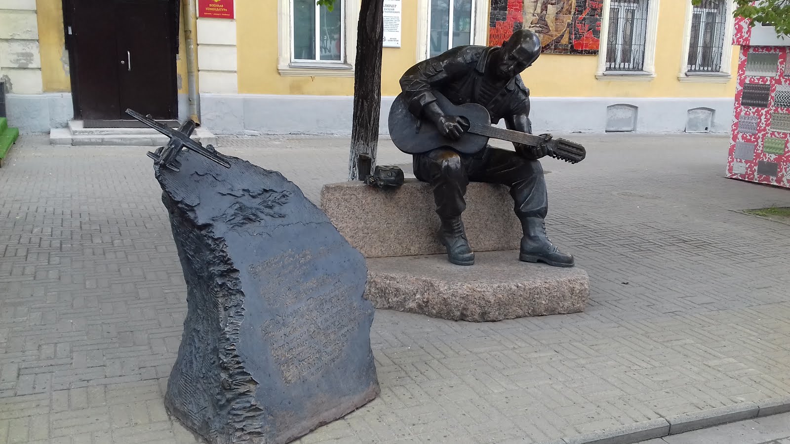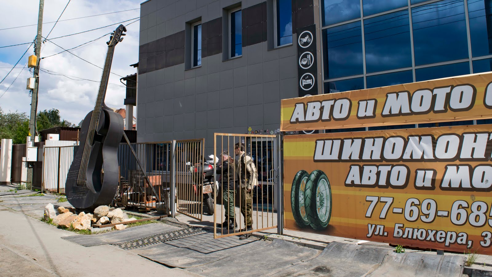 В Челябинске мне бросается на глаза огромная металлическая гитара у ворот здания и рядом стоящий мотоцикл.