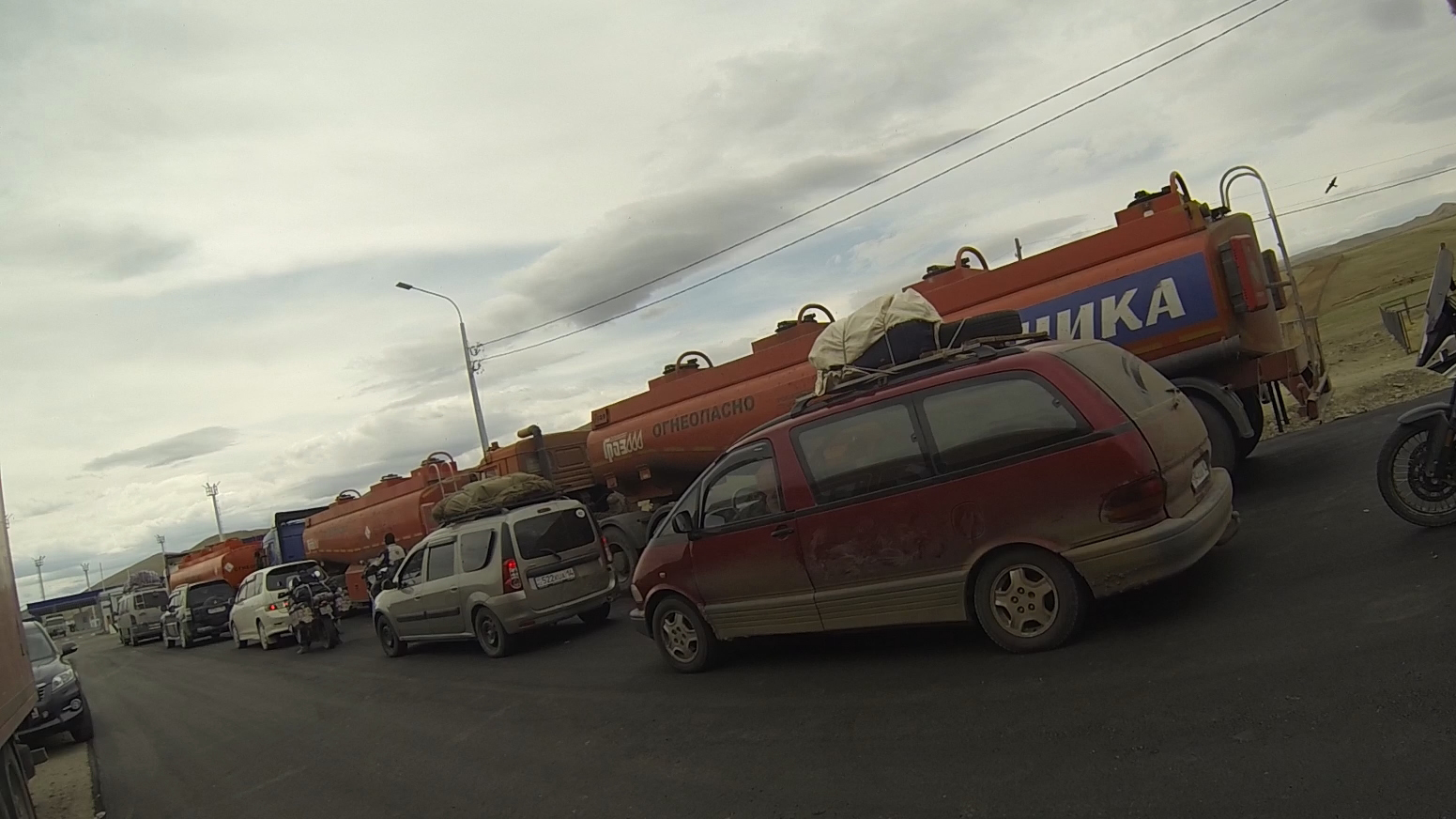 Ещё несколько русских туристов, которые решили на денёк заехать в Монголию, прогуляться и вернуться. И конечно же российские бензовозы, но у них своя очередь. Вот так общей толпой сперва у нашей, а потом и у монгольской границы мы весело проводим пол дня. Между двумя пропускными пунктами нереально огромное расстояние в 25 км. Теперь ясно почему пешком не пускают. Выезжаю с КПП уже в 16 вечера.