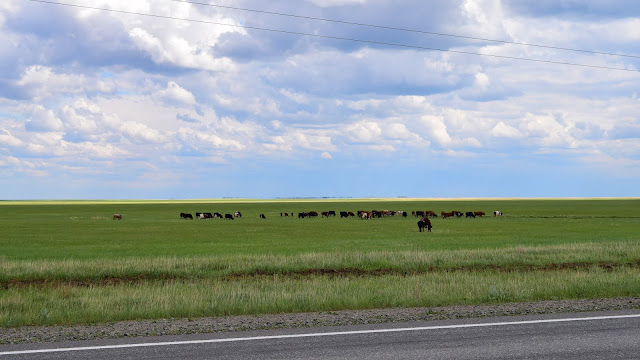 После границы заправка, завтрак в кафе и тут же размен денег. Бензин по 26р, страховка 750. Дорога от границы до Петропавловска километров 50 и она как после бомбёжки. Мне показалось что её даже и не собирались ремонтировать. Асфальт там отсутствует изначально. Щебёнка укатанная в перемешку с глиной. После города начинается великолепное шоссе, а за обочиной бескрайние поля, дорога прямая, лети хоть 200, но все помнят про баснословные штрафы. И по этой причине я ползу и меня снова тянет в сон.