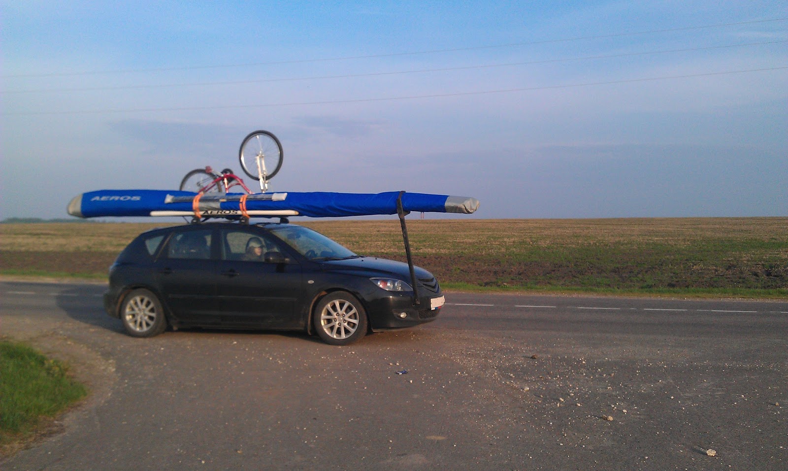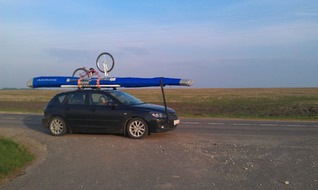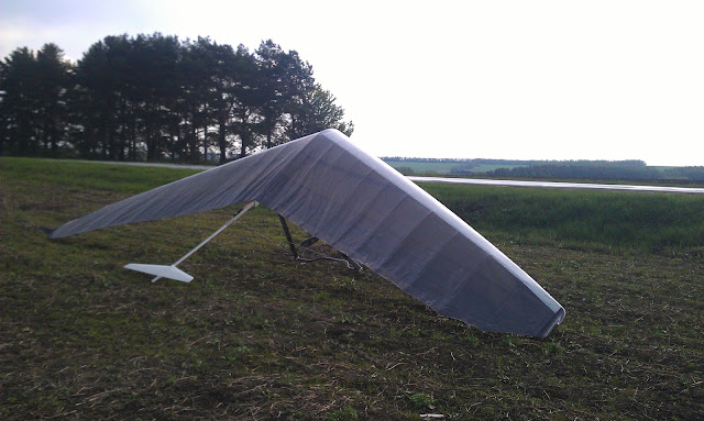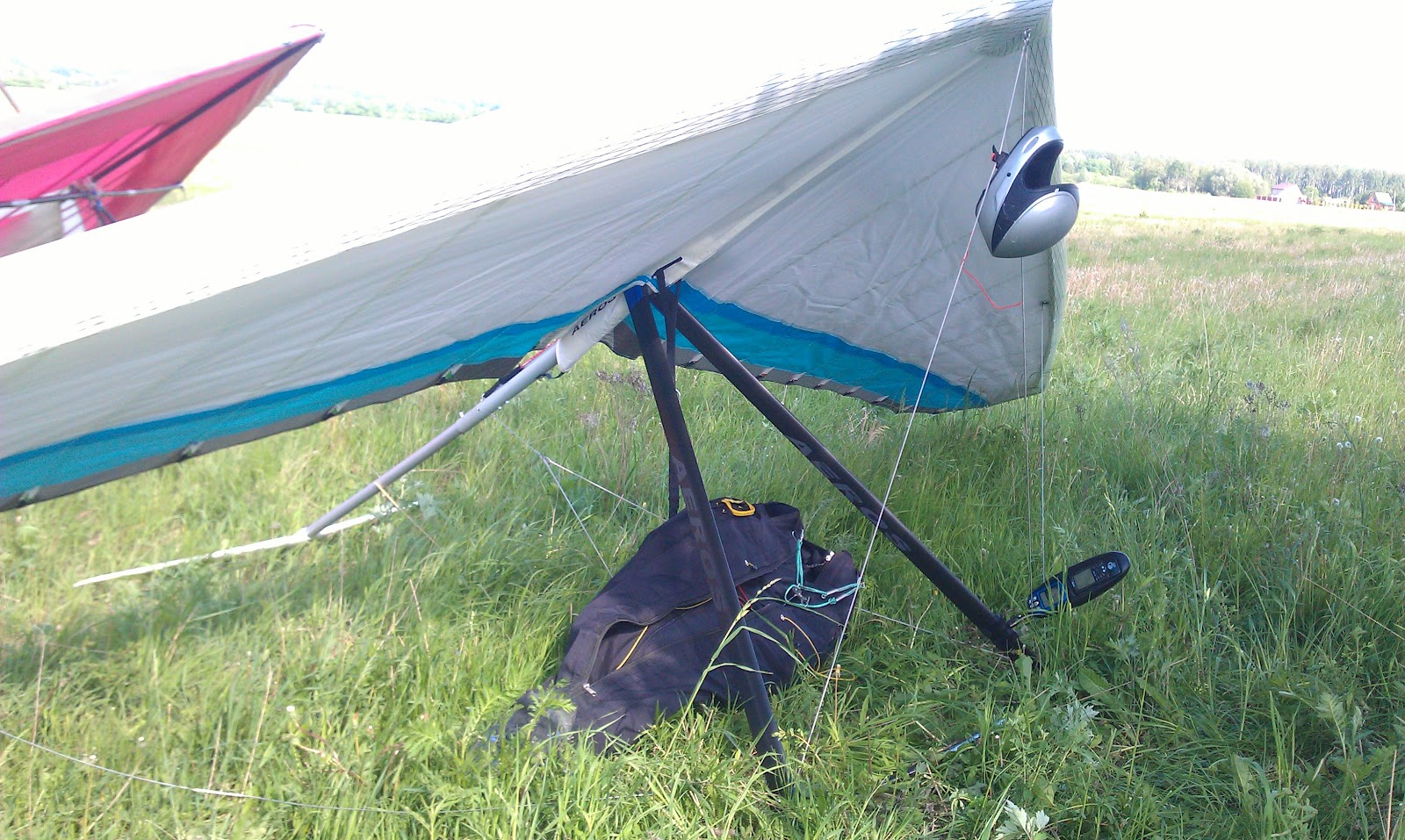 Летали мы в 40-а км от Дракино, поворот на Стрелковку. После того как я собрал аппарат, уложил чехлы, сгонял на моцике за тросом, ни кто ещё не был готов лететь, и так уж получилось что я привёз трос самому себе. Первая затяжка 300м, отцеп, разворот и на полиспасте по прямой на старт, первый пузырик и разворот над дорогой за стартом был уже на 70м, галс и посадка. крутить было нечего, грустная перспектива на весь оставшийся день. За мной Олег, два Макса и Серёга. Олег с Максом повыкручивали по 200...300м и сели. Затем трос упал за речку на деревья, и запутался в ветках на высоте около 10...15м.