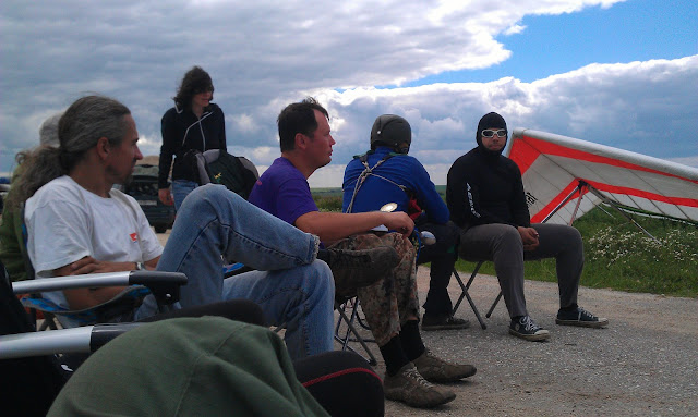 По небу гуляли хмурые тучи с намёками на шквальные валики, но к обеду всё рассосалось и мы продолжали ждать остальных. Они приехали только к 18 вечера. За это время Жора, мой приятель по старой работе успел выехать из Москвы, доехать до Ростова на Дону, доехать до нас, проторчать с нами часа 4 и уехать, когда от переразвития заморосил дождь, означающий закрытие так и не начавшегося полётного дня. Досаде небыло предела, выходные всего 3 дня, третий из них я собирался провести на даче, а первый потратил на пустое ожидание остальных. Считаю что выезжать из Москвы сутра и тащиться за 350км, теряя на это целый день, - непозволительное расточительство времени, тем более прогноз не оправдался и погода оказалась намного лучше.