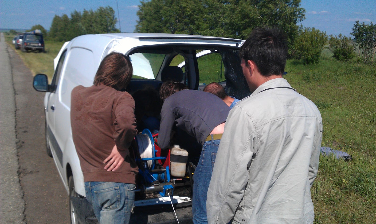 Тяпница, вечер, загрузка в гараже, 23-00 забираю Сержо из Домодеово, к 6-00 мы в Хомутово. Дорога от Ефремова до Хомутово около 60км жесть, эта Р120 заброшенная стройка, почти половину по не раскатанному гравию. Подъезжая к старту обнаруживаем 2-х бегущих по обочине нам навстречу кабанов, на секунду мы все остановились и оцепенели, но кабаны чуть раньше нас пришли в себя и свернули в поле, пока я включал фотик они скрылись в высокой траве и только спины и загнутые хвостики весело и синхронно подпрыгивали дуг за дружкой.