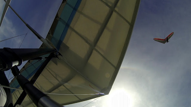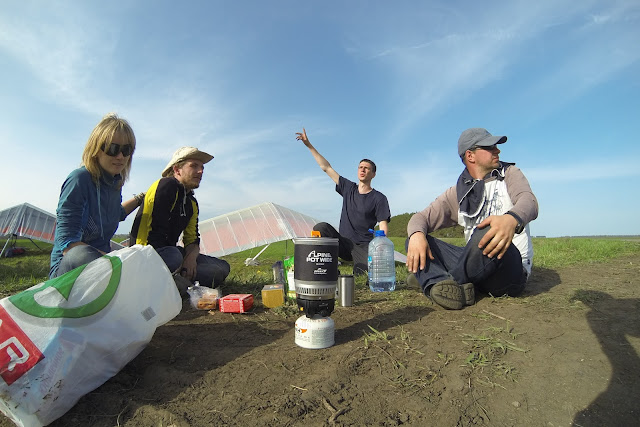 В воздухе в это время уже где-то летал Серж, Илья, Антон и Оля. Я начал аккуратненько крутить над смерчиками, но подъём был не сильный, потом заметил внизу крутящую Сашу, сверху казалось что она намного больше меня сносилась по ветру в спиралях, я решил попробовать тоже посноситься, на высоте около 1500 она меня догнала, а Серёга приспустился погреться, и мы втроём встали в одну спираль, от чего я стал крутить ещё аккуратнее шире и тупее. Всех это сбило с толку и мы честно говоря хреново набирали вместе. Перенять опыт как-то не получалось.