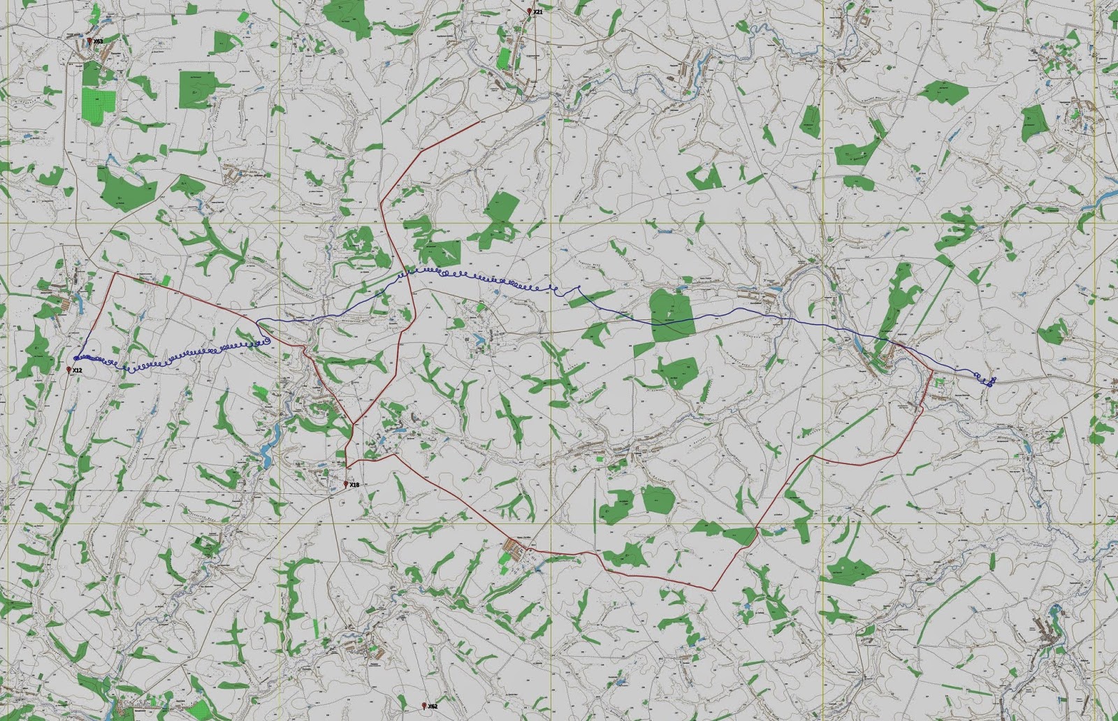 Макс альт 1400м два раза подряд. После штуки поток ослабевал и размазывался. Бомбанулся потому, что решил лететь по ветру в большой просвет, вместо того, чтобы поворачивать в сторону к облачкам. До кромки так и не докрутил. Красным цветом изображён маршрут подбора, небольшой крюк это заезд за Севой. Половина пути была проделана по грунтовым дорогам, идеального качества.