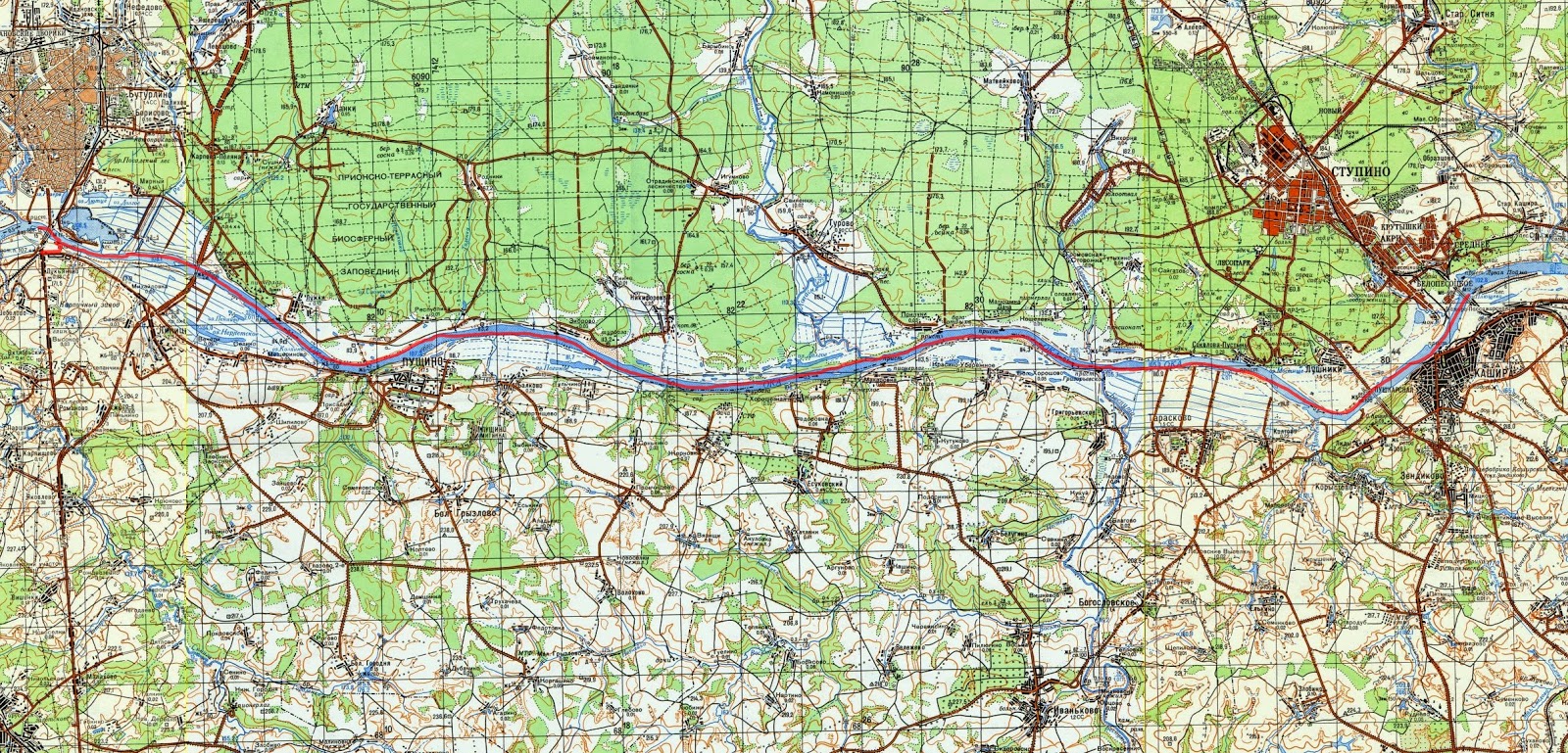 Задумали с товарищем небольшое путешествие на байдарке. Спланировали маршрут по Оке по направлению течения от Серпухова до Каширы, а если останется время то и до Коломны. Расчёт был такой: скорость течения исходя из обозначений на топографической карте 5 км/ч, наша собственная скорость ещё столько же, и того до Каширы около 50км хотели доплыть за 5...8 часов с учётом остановок. А на второй день пульнуть до Коломны ещё 50км. Но погода и отсутствие опыта внесли свои коррективы и вместо того чтобы плыть по течению мы 2 дня боролись со встречным ветром, который оказывал большее влияние. Так мы с трудом за первый день преодолели 26км, что составило половину от минимального плана. Это при том, что гребли почти 9 часов подряд с перекурами разумеется. Заранее по яндекс картам и фотографиям на них мы выбрали предполагаемую зону ночёвки. В этом месте было много живописных мест с песчаными берегами, но также многие из них уже были заняты отдыхающими на машинах. Нам повезло и мы отыскали райский пляж прикрытый зарослями с трёх сторон от берега, без отходов и следов цивилизации и такое же нетронутое оставили его после себя.