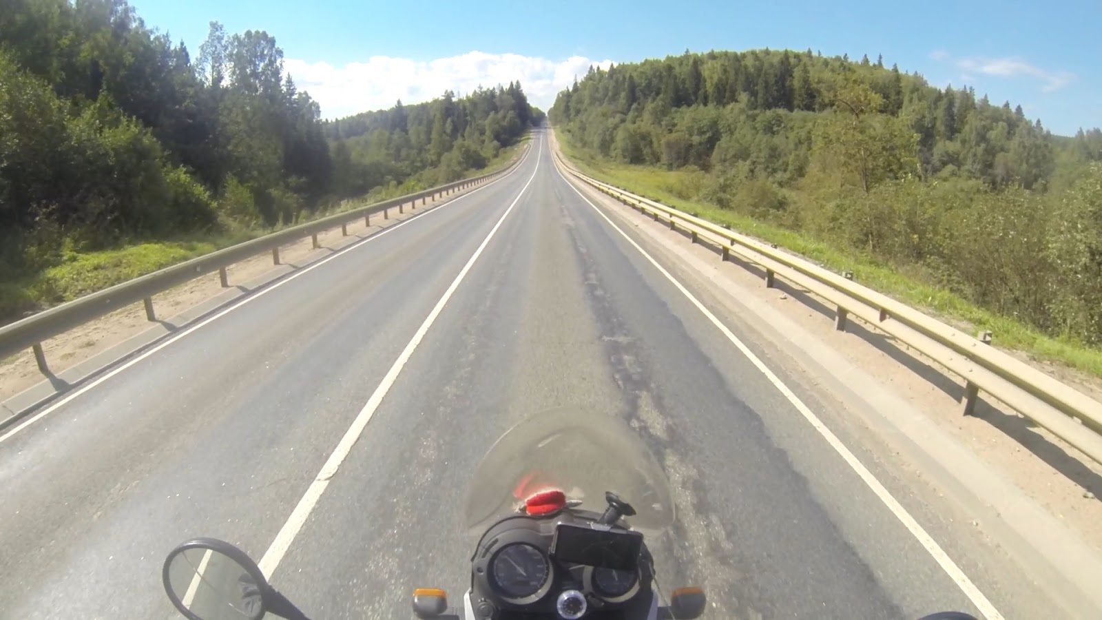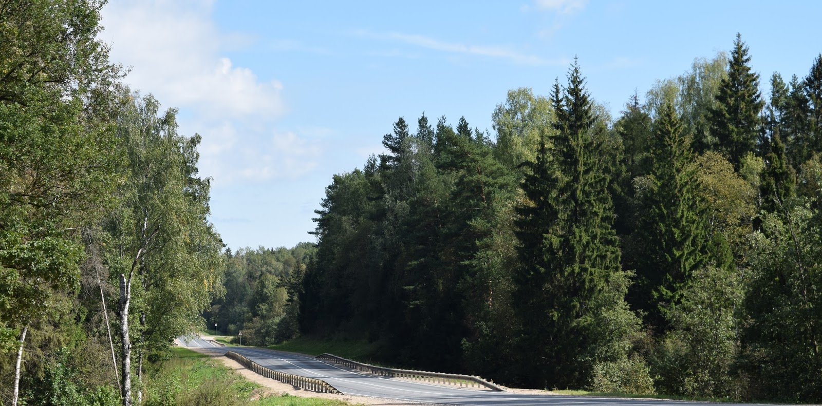 А это уже сегодняшнее. километров 30 от Ярославля. Остановился чтобы одеть куртку, а то совсем замёрз.Возле Ростова появилось солнце и жизнь начала налаживаться. Кажется я где-то свернул не туда и попал на очень красивую дорогу, окружённую хвойными лесами, с горками и подъёмами, прям как я люблю. Машин оказалось совсем мало, я даже засомневался туда ли я еду. Остановился включил планшет, сверился, всё нормально, еду туда. Просто это двойник, идёт параллельно трассе. Скоро и я на ней оказался.