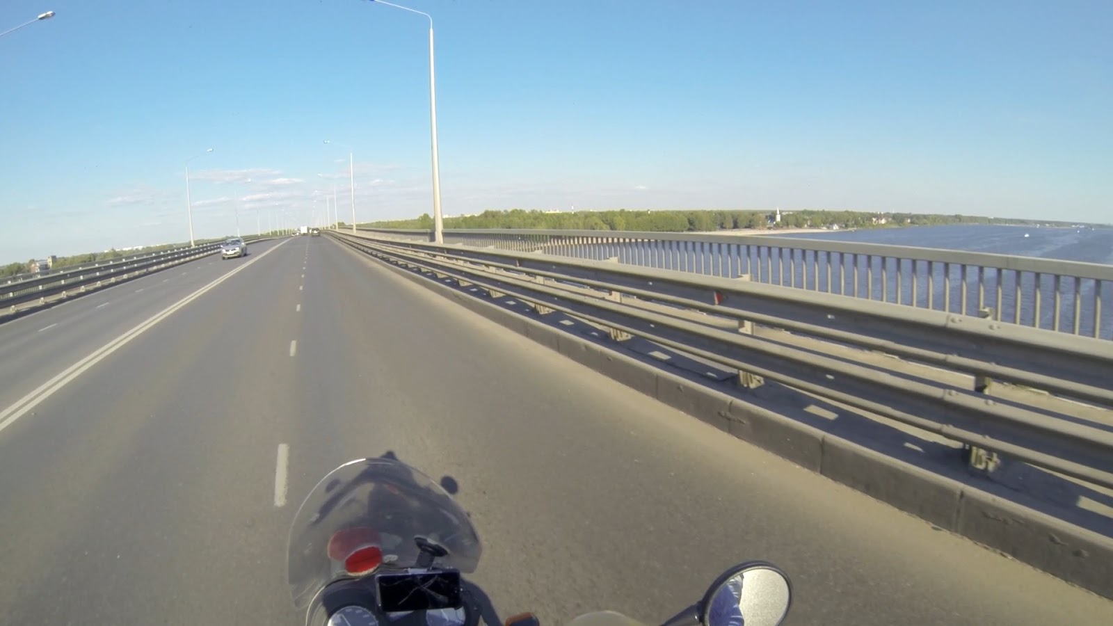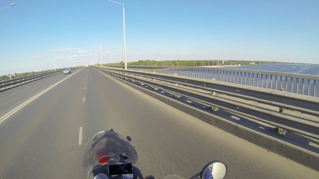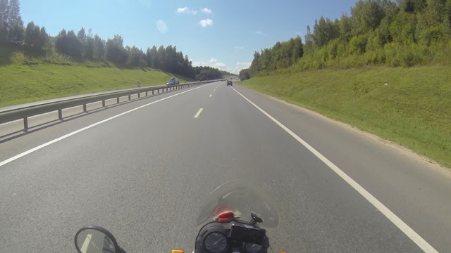 В 12-00 я выехал за МКАД и ещё пол часа крался в междурядье, о бедные автомобилисты, сколько же они времени там потеряли, даже боюсь представить. Потом дорога была красивая но не интересная. Скоростная двухполоска в каждом направлении с высоким металлическим отбойником по середине, так что даже мотобрата не всегда заметишь. Где-то в районе Ростова дорога сузилась и заиграла горками, хвойными лесами и красивыми видами. Но перед Ярославлем снова расширилась подставляя меня всем ветрам. Сам город чистый, ухоженный., автомобилисты тут не спешат пропускать мот как в Москве. Мотоциклов вообще мало.
