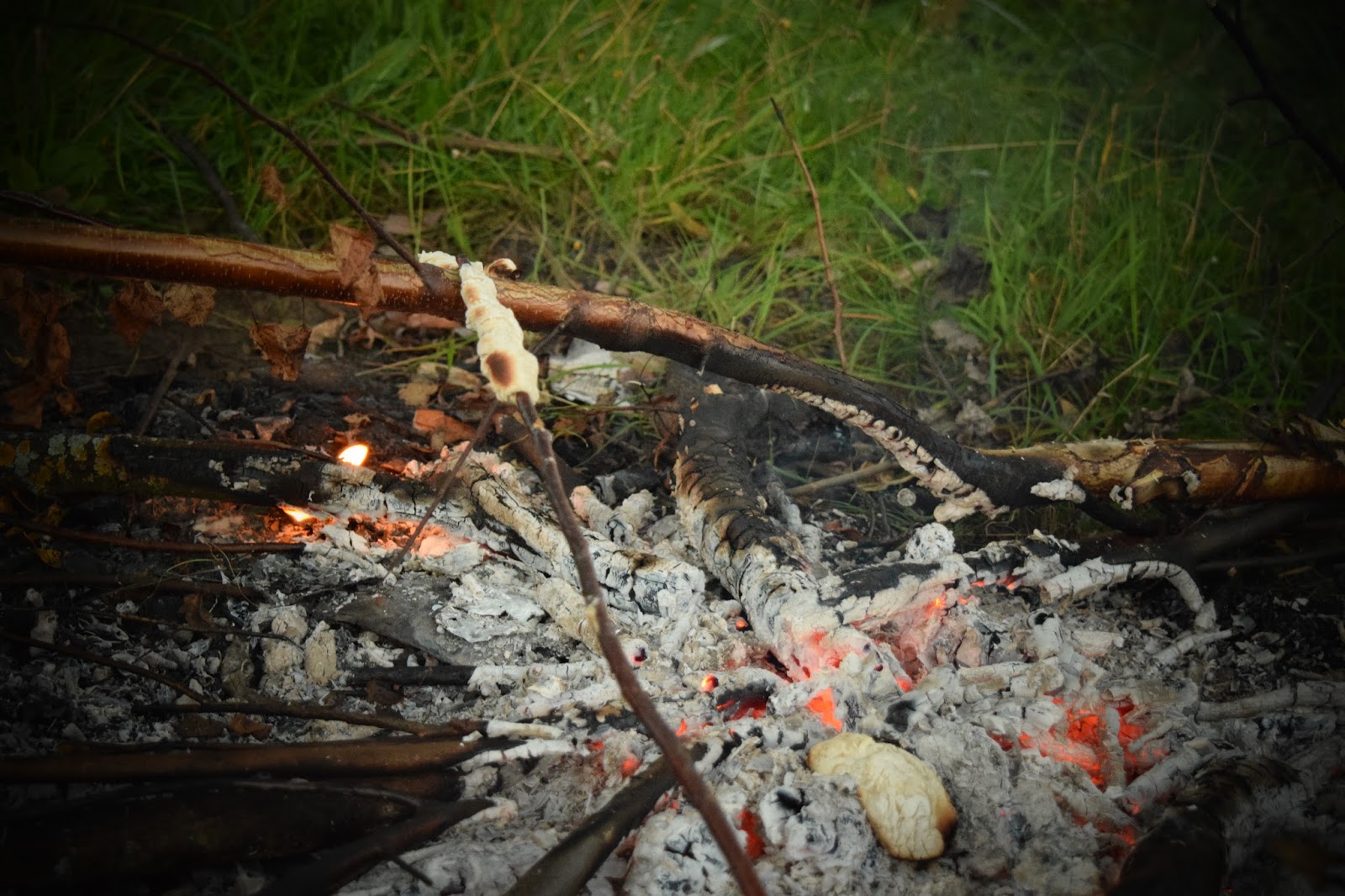 Затем настало время ужина, в очередной раз провозившись с горелкой около часа, и недобившись от неё ни чего плеснул весь её бензин на дрова , чтоб хоть с разведением костра не терять времени. Съел булочки с яблоками испечённые лично с вечера, запил фантой и уж как нибудь без чая обойдусь. На фото мой шомпольный хлеб. Впечатления: готовить легко, но надо добавлять дрожжи и чуть больше терпения, тогда будет вкуснее.