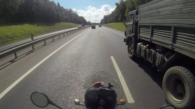 На трассе перед Москвой догнал четвёрку мотоциклистов, трое из них на одинаковых огромных Харлеях, а впереди чел на Голде. При чём больше всех размахивал руками и подавал знаки тот, что ехал третий, буд-то он ведущий колонны. Вобщем я пристроился за ними и старался держаться рядом. Очень уж интересно мне было поездить с крутыми дядьками. Крайний распугивал всех своим прямотоком, а я ехал сразу за ним и кажется его выхлоп здорово нагревал воздух передо мной. Особенно в пробке ехать за ним было очень душно. Вскоре к нам пристроился ещё один стрит и стало совсем весело. У МКАДа мы разъехались кто куда, я на Восток, решил что не хочу уже ползти через центр по светофорам. Теперь вот лёжа на диване дописываю эти строки и еду на джимхану, которая, кажется, уже началась.