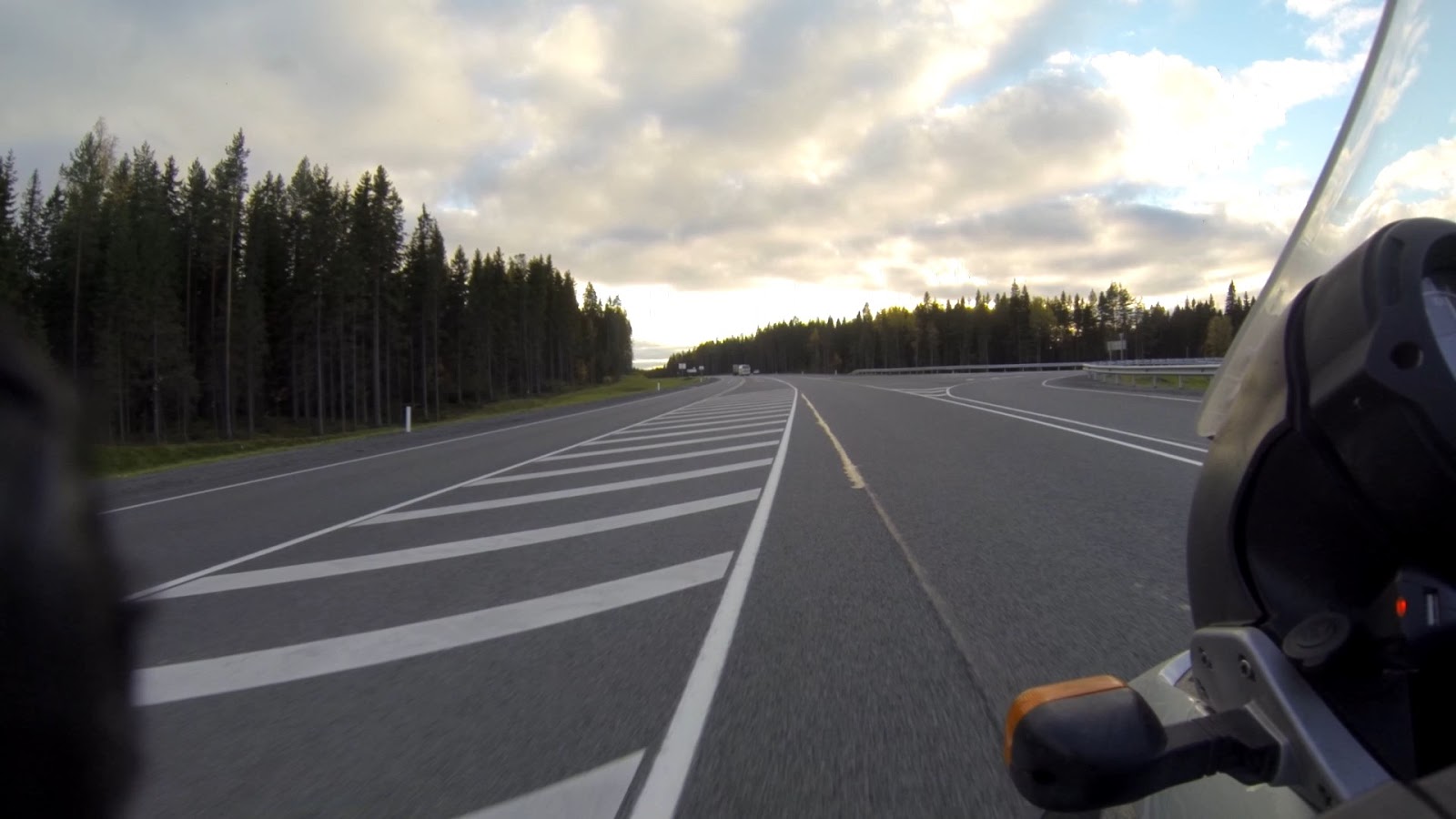 После Весьегонска на Устюжину, асфальт только возле крупных н.п. километров 10 затем старая знакомая грунтовка. Ползти по ней надоедает, хочется уже поскорей на нормальную дорогу. Солнце жарит, температура под 20, снимаю с себя какой-то слой одежды. Наконец-то выехав на трассу Кострома — Новая Ладога обнаруживаю что телефон, на ветровом стекле на присосках был закреплен слишком высоко и раскачиваясь на ухабах треснул стекло в месте его крепления и трещина почти на половину рассекает его, но вроде ничего, держится. Дальше маршрут лежит по федеральным трассам, так что если повезёт трещина дальше не пойдёт. Дорога идеальная, пейзажи восхитительные. осень раскрашивает всё потихоньку в золото. На половине пути до Мурманской трасы зачётное пристанище для путника: справа кафе, слева заправка, полно народу, кормят вкусно, недорого, то что надо. Заправляю себя и мот, теперь до вечера не отрывать зад от седла! Небо впереди сгущается останавливаюсь одеть дождевик и делаю фото.